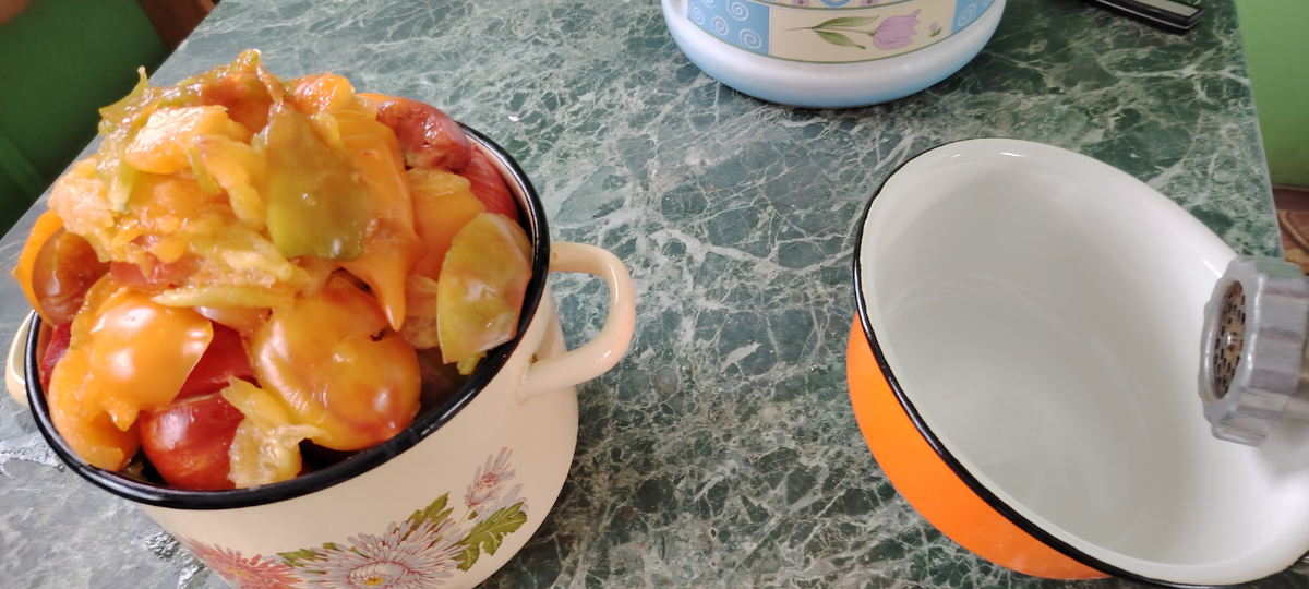 Приветствую моих дорогих подписчиков и гостей канала. Рецептом не варёной аджики поделился коллега мужа по работе несколько лет назад. Вернее, сначала самой аджикой, потом технологией её производства. Я слушала рецепт по громкой связи телефона. Теперь делаю эту аджику каждый год. Долго она не хранится, не больше месяца. Поэтому делаю столько, сколько съедим в течении этого срока. На 2 килограмма очень спелых помидор: 2-3 болгарский перца, 1-2 острых перца, 1 головка чеснока, 1 ст. ложка соли. На даче у меня сохранилась ручная мясорубка. Служит мне все ещё. Собрала немного перцев, достала чеснок. Все перемолола на мясорубке. Если оставить семена острого перца, то аджика будет более ядреной. Можно перемолоть еще зелень петрушки. Добавила соль, перемешала и убрала аджику в холодильник. Через несколько часов убираю лишнюю жидкость с помощью сита. Погружаю сито в аджику и ложкой отчерпываю воду, которая собирается на дне сита. Так аджика будет погуще. Ее можно будет положить н