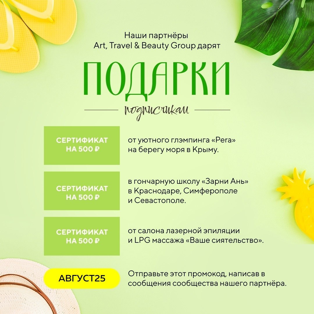 ☀️ Лето дарит не только солнце, но и ПОДАРКИ 🎁 Ловите волну скидок 🌊 от наших друзей 💃🍰✨ Мы собрали летнюю подборку бонусов для НОВЫХ клиентов. Четыре уникальных места, где можно отдохнуть, вдохновиться и стать еще прекраснее - и все это со скидками! Выбирайте свое настроение: 🌊 1. Глэмпинг Pera. Уютный глэмпинг на берегу моря в Крыму — роскошный отдых под звездами и шум прибоя. Море, свежий воздух и стильный купольный номер — все, чтобы отключиться от суеты. 🎫 Получите –500₽ на проживание и устройте себе перезагрузку на берегу Черного моря. 🎨 2. Мастерские «Зарни Ань» — лепите, как чувствуете, ведь глина вдохновляет! Попробуйте гончарство в Краснодаре, Севастополе или Симферополе 🎫 –500₽ на первое занятие - создайте свою чашку, тарелку или даже вазу. Ваша энергия в ваших руках! 💗 3. Студии красоты «Ваше Сиятельство» — сияние начинается здесь! Готовы к преображению? Воспользуйтесь скидкой 🎫 –500₽ на первую процедуру и доверьтесь профессионалам. Ваша уверенность начинаетс