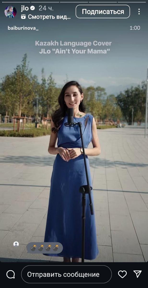 В ответ на пост Дженнифер Лопес поделилась кавером казахстанской исполнительницы на свою песню Казахстанская исполнительница Молдир Байбуринова перевела и исполнила на казахском языке песню Джей Ло «Ain’t Your Mama». Видео, которое напоминает полноценный клип, довольно быстро набрало популярность в соцсетях, собрав более 1,5 миллиона просмотров. Работу Молдир заметила и Джей Ло. Видео: Instagram/baiburinova_ ✍️Подписывайтесь на t.me/CMN_KZ