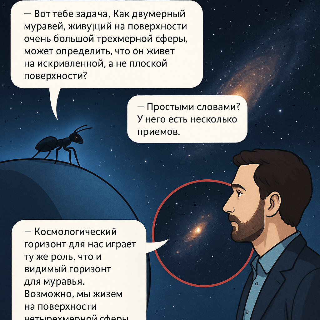 — Вот тебе задача. Как двумерный муравей, живущий на поверхности очень большой трёхмерной сферы, может понять, что он обитает на искривлённой поверхности, а не на плоскости? — Простыми словами? У него есть несколько приёмов. — Но ведь если сфера огромна, все эти эффекты исчезают? — Именно. При очень большом R гауссова кривизна 1/R² крошечна. Сумма углов треугольника отличается от 180° на ничтожные доли наносекунд, длина окружности почти равна 2πr, параллельный перенос даёт поворот, который компас муравья не заметит. На масштабах, меньших радиуса, его мир выглядит совершенно плоским. — Тогда, может быть, горизонт станет для него уликой? Ведь за горизонтом «мира нет». — Вот тут и ловушка. Горизонт — это не «край мира», а ограничение линии зрения. На любой выпуклой поверхности — сфере, цилиндре, даже на кривой картофелине — он возникнет. Сам по себе горизонт не доказывает сферичности, он лишь косвенный признак кривизны. Без математики муравей решит, что живёт на плоском листе с краем. — Ч