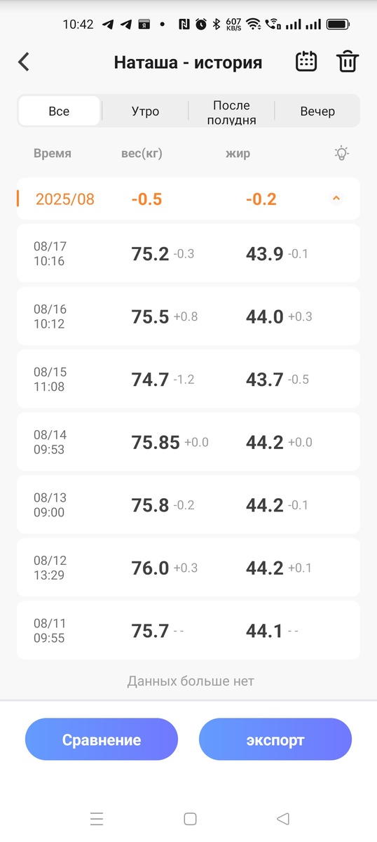День шестой С весом творится черти что и с боку бантик. Сегодня 75,2. Хотя день был углеводный, в том числе и ужин. Но вроде бы уходит объём. Нужно сделать замеры и вести контроль ещё за ними. Всё таки взвешиваться каждый день это не такая плохая идея. Меня очень мотивирует увиденные цифры 74. Если бы я видела только начальные и конечные результаты, то -200 г меня бы вряд ли вдохновили С БЖУ совсем беда. В жизни бы не подумала что я ем столько жиров. Всё таки подсчёт занимательная вещь. Фраза "ты то, что ты ешь" заиграла новыми красками 😀 в калорийность почти вписалась, уже радует. Учусь потихоньку определять порции "на глаз". Сначала кладу планируемую еду, потом перекладываю на тарелку через весы, убираю лишнее. Примерно 1/3 🤦♂️ Завтрак, или, всё таки обед? выглядел так. Подожду ещё неделю, потом буду смотреть, стоит что-то в питании менять или нет. А как вы думаете, смогу ли я похудеть не меняя питания, или БЖУ всё таки важнее калорийности? У кого нибудь был опыт худеть на