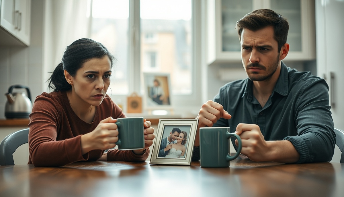 Я встала, подошла к полке в гостиной. Взяла наше свадебное фото — мы с Денисом на фоне дворца бракосочетаний, белое платье, его смущённая улыбка. Поставила фото перед ним.