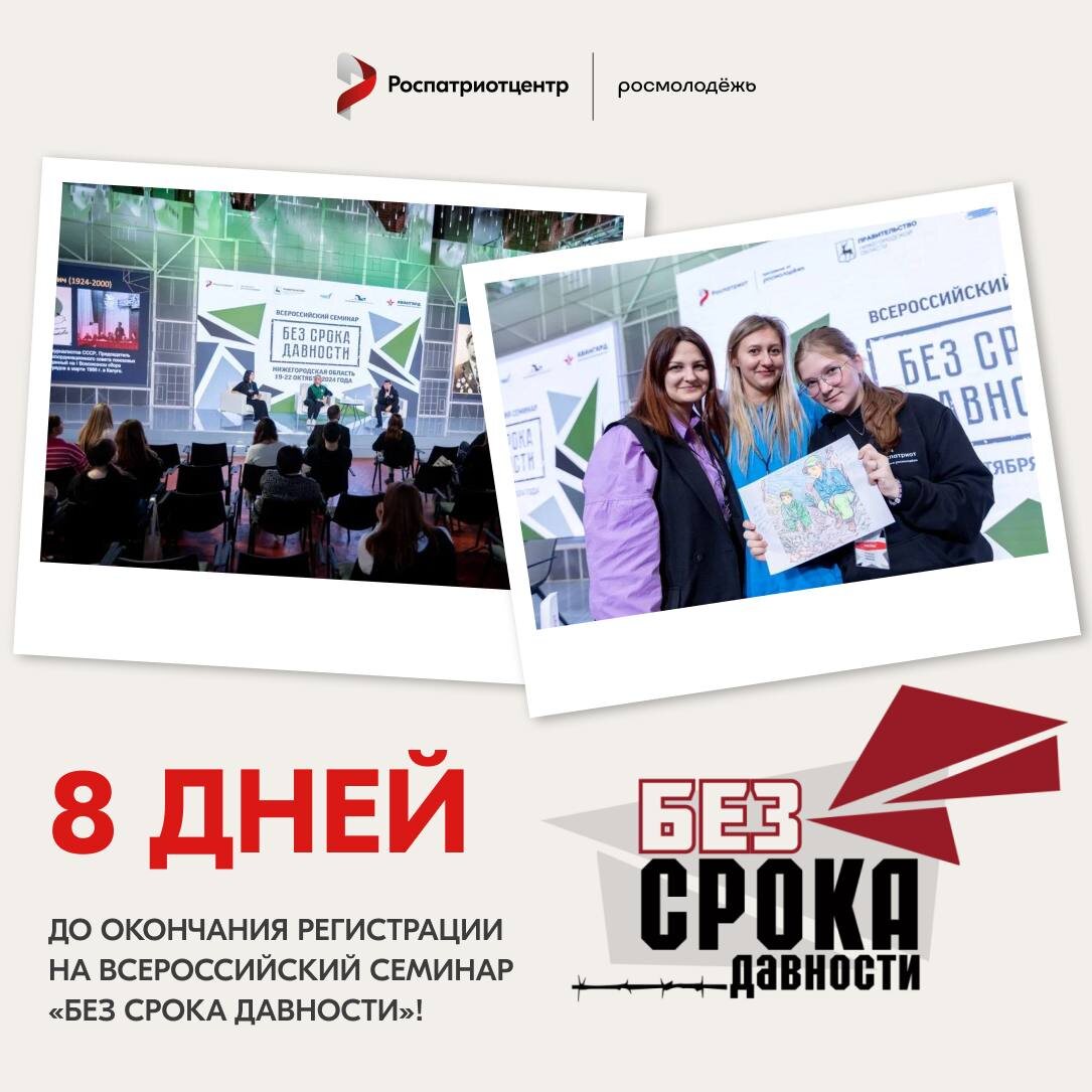 Осталось всего 8 дней... До окончания регистрации на Всероссийский семинар «Без срока давности»! В этом году семинар пройдёт с 18 по 21 сентября в городе Саранск 📍 «Без срока давности» объединит студентов, активистов патриотических клубов, представителей НКО, педагогов и учёных с одной целью — защита исторической памяти нашей страны. Регистрация по ссылке закончится уже 25 августа 👈🏻 Мы ждём каждого из вас!