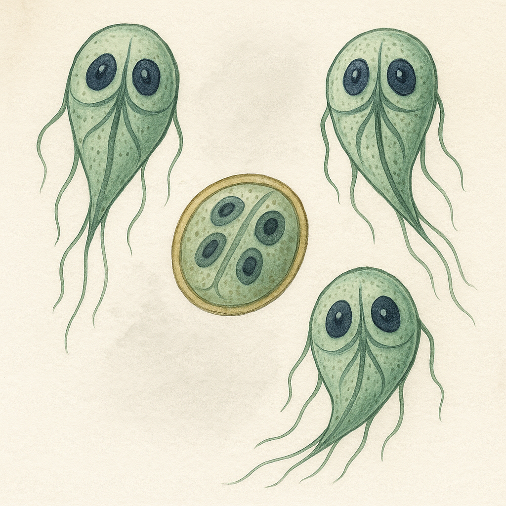 Вне человеческого организма лямблии превращаются в «спящих солдат» — цисты. Это как капсула выживания: в воде цисты могут прятаться неделями, не теряя способности заразить. Стоит проглотить их с водой или едой — и они оживают, превращаясь в активных паразитов.