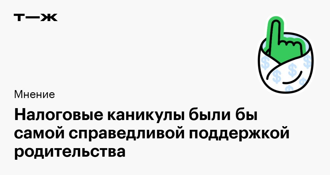 Читатель уверен, что многие пары в России хотят завести ребенка, но боятся существенного падения уровня жизни из-за выхода одного из партнеров в декрет. Он считает, что решить эту проблемы могли бы налоговые каникулы. Для поддержки родительства идеальным вариантом был бы возврат НДФЛ за последние пять лет либо налоговые каникулы по НДФЛ на последующие пять лет. Без привязки к максимальной сумме заработной платы — не важно, сколько ты зарабатываешь. Вот несколько причин, почему автор считает такую поддержку самой справедливой: ⏺ Ты получаешь только то, что сам заработал, и не перекладываешь финансовую ответственность на других. ⏺ Распоряжаешься вычетом на свое усмотрение, а не с множеством ограничений, как в случае с материнским капиталом. ⏺ В такой мере поддержки просто отсутствует возможность злоупотребления. ⏺ Подобные налоговые льготы способствовали бы обелению рынка труда. Что вы думаете о таком предложении? Напишите в комментариях: https://t-j.ru/d-tg/nalogovye-kanikuly-op