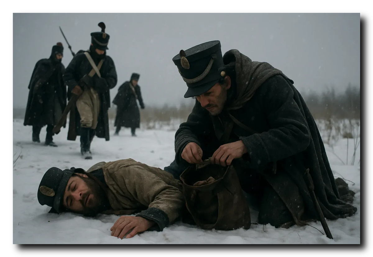 И вот мы подходим к кульминации ужаса. Раненый солдат, у которого подозревали наличие ценностей, был обречен. Его не просто бросали. Его целенаправленно добивали свои же, чтобы забрать последнее. Это был уже не просто грабеж ради выживания (сапоги, шинель). Это была низменная жадность, животный инстинкт, помноженный на полную безнаказанность. Братство, рожденное в огне революции, сгорело в пожарах Москвы и замерзло в русских снегах.