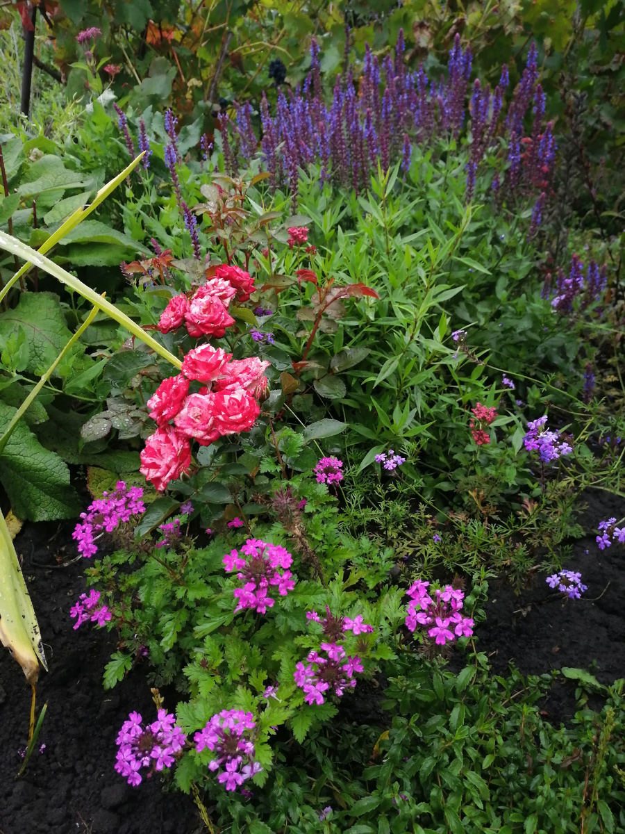 Вот если бы мне сегодня не надо было посадить полученные растения, я бы в сад и не поехала. Дождь у нас. А так деваться некуда - поэтому отмачивала полученное от упаковочной глины, растаскивала по местам (благо, места эти были готовы), ну и задно немного полюбовалась на мрачно-красивое. (Сил писать что-то умное у меня тоже нет, так что сегодня побуду чукчей - что вижу, про то и пою) Вот спрейка 'Arrow Folies' в компании вербены канадской, повторно зацветшего простецкого шалфея дубравного и обрезанного после цветения кентрантуса. Рядом маячит вербена тонкорассеченная. Сочетаньице получилось то еще - обычно у меня тут роза и шалфей, без переливов сиреневого. Ну а нынче вот так. Я махнула рукой - вербена однолетник, помаячит и уйдет. А если будет пересеваться, так ее и убрать недолго. Вообще не этот бы цвет - ей бы цены не было с ее аккуратным невысоким кустиком с резными листьями. Но цвет... Вот не может она быть как одна из вербен жестких?.. Вот эта хороша несказанно. И, чувствую, буде