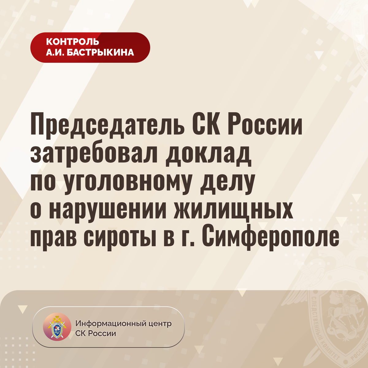 Председатель СК России затребовал доклад по уголовному делу о нарушении жилищных прав сироты в г. Симферополе В комментариях в аккаунте приёмной Председателя СК России А.И. Бастрыкина «ВКонтакте» обратился сирота из города Симферополя Республики Крым по вопросу длительного непредоставления ему положенного по закону жилья. Более четырех лет мужчина состоит в специализированной очереди, однако, несмотря на наличие вступившего в законную силу судебного решения, его права до настоящего времени не реализованы. Многочисленные обращения в уполномоченные органы результатов не принесли. В ГСУ СК России по Республике Крым и городу Севастополю расследуется уголовное дело. Заявитель признан потерпевшим. Председатель Следственного комитета Российской Федерации Александр Иванович Бастрыкин затребовал у руководителя ГСУ СК России по Республике Крым и городу Севастополю Владимира Николаевича Терентьева доклад о ходе и результатах расследования уголовного дела. Исполнение поручения поставлено на контро