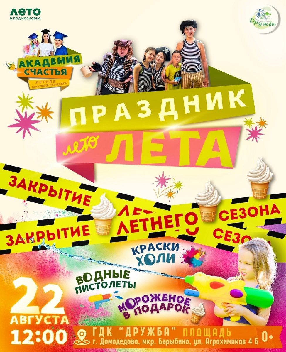 ✨ 📢 ПРАЗДНИК ЛЕТА 😎 🙌 Всем привет! Мамы и папы, для вас СУПЕР НОВОСТЬ 💥 Приглашаем всех детей Барыбино, Руполиса, Растуново, Гальчино и всего г.о. Домодедово на водный пиратский праздник! Главным событием праздника станут 🤩 ПАТИ ШОУ с КРАСКАМИ ХОЛИ 🔫 БИТВА с ВОДНЫМИ ПИСТОЛЕТАМИ 🐳 КУПАНИЕ ПОД ВОДОЙ ☝️ ДРЕСС КОД 〰️ с собой берём водный пистолет 〰️ надеваем костюм (или элементы костюма) пирата 〰️ ааа, кстати, ☝️ краски Холи можно приобрести на празднике💲 🚫 Возраст: 0+ 📆 22.08.2025🕒12:00 🏢 Городской дом культуры «Дружба» 📍 г.о. Домодедово, мкрн.Барыбино, улица Агрохимиков, д.4Б 💰 Вход свободный❗️ ✅ Мероприятия Домодедово https://dzen.ru/id/66f10385cc4c5a16f7b5fb02 http://vk.com/domodedovo_events http://dzen.ru/domodedovo_events