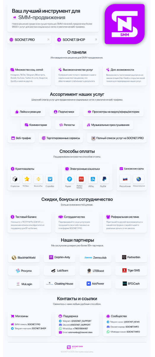 «Если вас нет в интернете, вы не существуете.» — Билл Гейтс А чтобы быть в интернете, нужно быть на виду. В 2025 году SMM — это не просто реклама. Это системная работа, которая делает твой бренд заметным, узнаваемым и востребованным. Сегодня в соцсетях и контент-платформах каждый день рождаются миллионы публикаций. Если ты не занимаешь своё место в этом потоке, твой проект растворяется в шуме. SMM — это: Но делать всё это вручную — долго и дорого. Именно поэтому мы создали SMM Панель SocNet — удобный, быстрый и мощный инструмент, который автоматизирует продвижение на топовых площадках. Используй нашу SMM Панель для накрутки и продвижения в Фейсбук, Инстаграм, Телеграм, Спотифай, Саундклауд, Ютуб, Реддит, Тредс, Кик, Дискорд, Линкедин, Лайки, Твич, Квай, ТикТок, Траст Пилот, Эппл Мьюзик, Трипэдвайзор, Снэпчат и других платформах. Подписчики, лайки, просмотры, репосты, прослушивания, зрители, реакции, комментарии — всё в одном месте, без сложных настроек и лишних затрат. Дарим $1 на перв