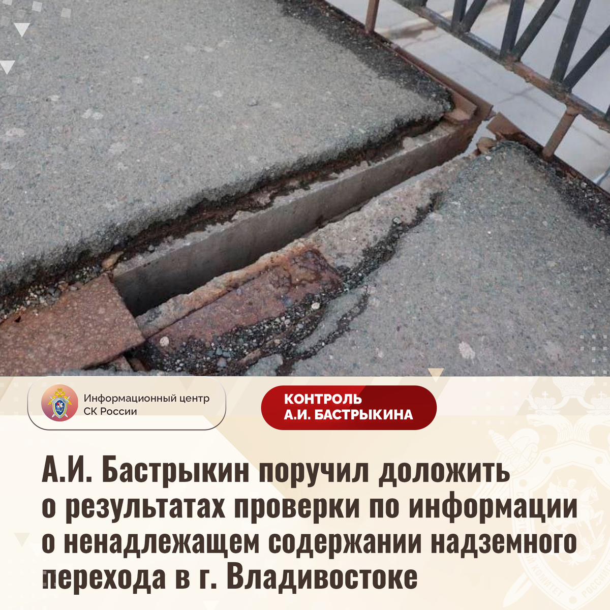 А.И. Бастрыкин поручил доложить о результатах проверки по информации о ненадлежащем содержании надземного перехода в г. Владивостоке В СМИ сообщается о ненадлежащем содержании надземного перехода на улице Баляева в городе Владивостоке. Несмотря на проведение в 2023 году ремонта, в настоящее время сооружение находится в непригодном состоянии и представляет угрозу для безопасности граждан. Ранее одна из женщин получила на объекте травму ноги, ей потребовалась медицинская помощь. Многочисленные обращения местных жителей в различные инстанции результатов не принесли. В СУ СК России по Приморскому краю по данному факту организована процессуальная проверка. Председатель Следственного комитета Российской Федерации Александр Иванович Бастрыкин поручил руководителю СУ СК России по Приморскому краю Эдуарду Анатольевичу Трубчику представить доклад о ходе и результатах процессуальной проверки, поставив ее на контроль в центральном аппарате ведомства. #СледственныйКомитет #СКРоссии #СКР #ИЦСКР #Инф
