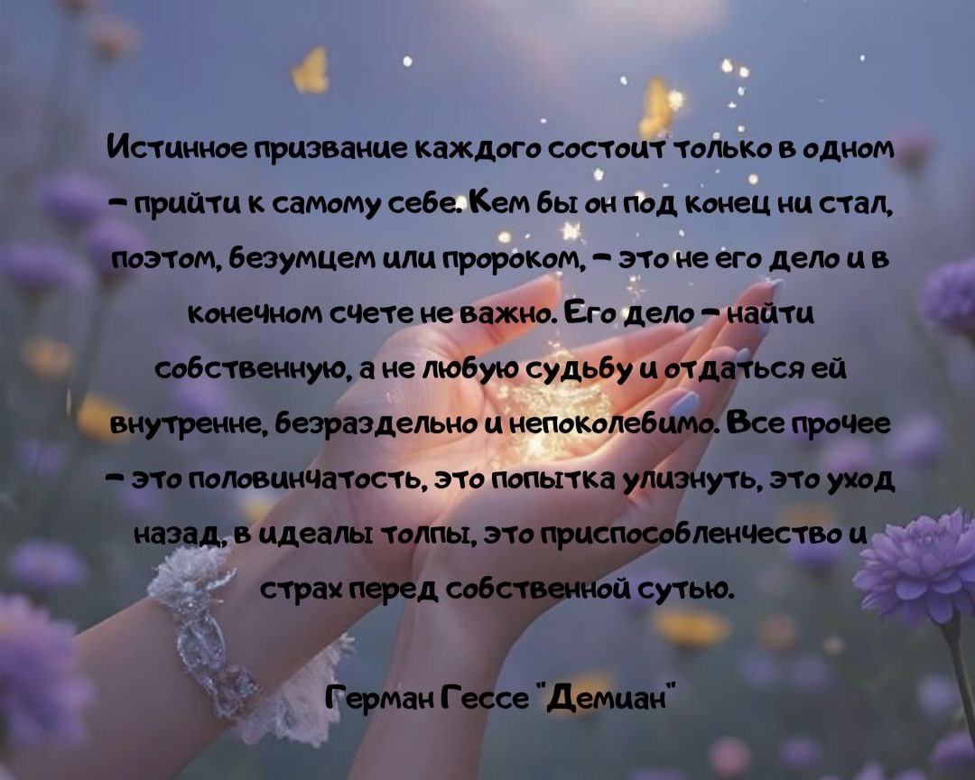 "Истинное призвание каждого состоит только в одном – прийти к самому себе…" – эти слова Германа Гессе из романа "Демиан" звучат как набатный колокол, будящий от дремоты страха. Они пронизывают самую суть человеческого бытия, напоминая о забытой цели: не вписаться, а реализоваться. Сколько раз в своей практике я сталкиваюсь с людьми, потерявшими себя на полпути к "успеху", "признанию", "соответствию". Они возводят вокруг себя крепости из социальных ожиданий, боясь выглянуть за их стены и столкнуться с собственным "я". Они выбирают "любую судьбу", предложенную обществом, родителями, обстоятельствами, вместо того, чтобы прислушаться к тихому голосу внутри, шепчущему о том, кто они есть на самом деле. Этот голос часто заглушается громким хором сомнений и страхов: "А что подумают другие?", "Это слишком рискованно!", "Я недостаточно хорош!". Легче плыть по течению, нежели грести против него, но цена этой "легкости" - жизнь, прожитая чужой жизнью. Гессе говорит о "половинчатости", о "попытке