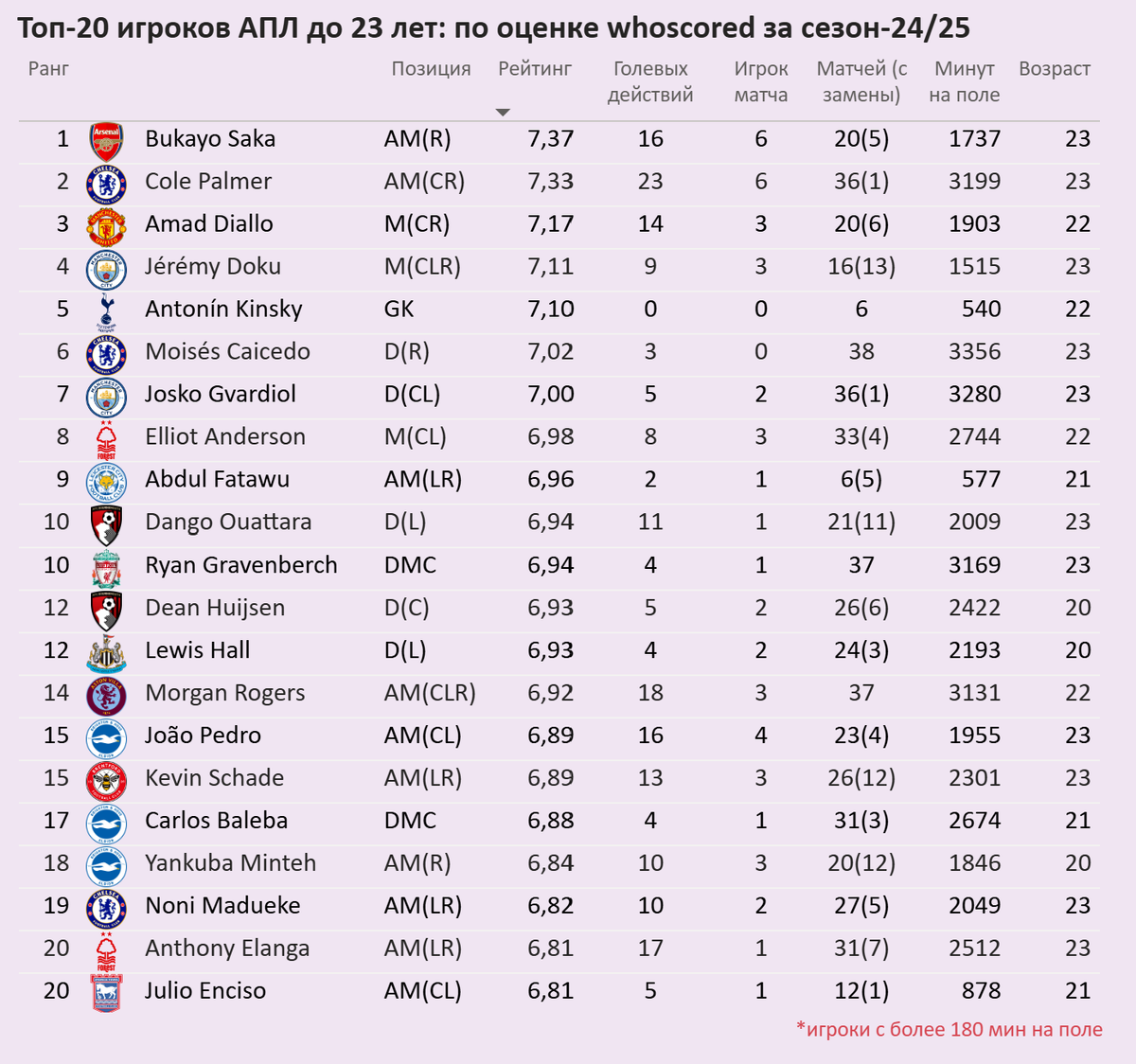 *рейтинги по игрокам сыгравших более 180 минут в лиге, позиции игроков указаны по первому значению что прописаны на сайте WhoScored (там их обычно сразу несколько и часто без приоритезации по количеству сыгранных минут/матчей на этих позициях).