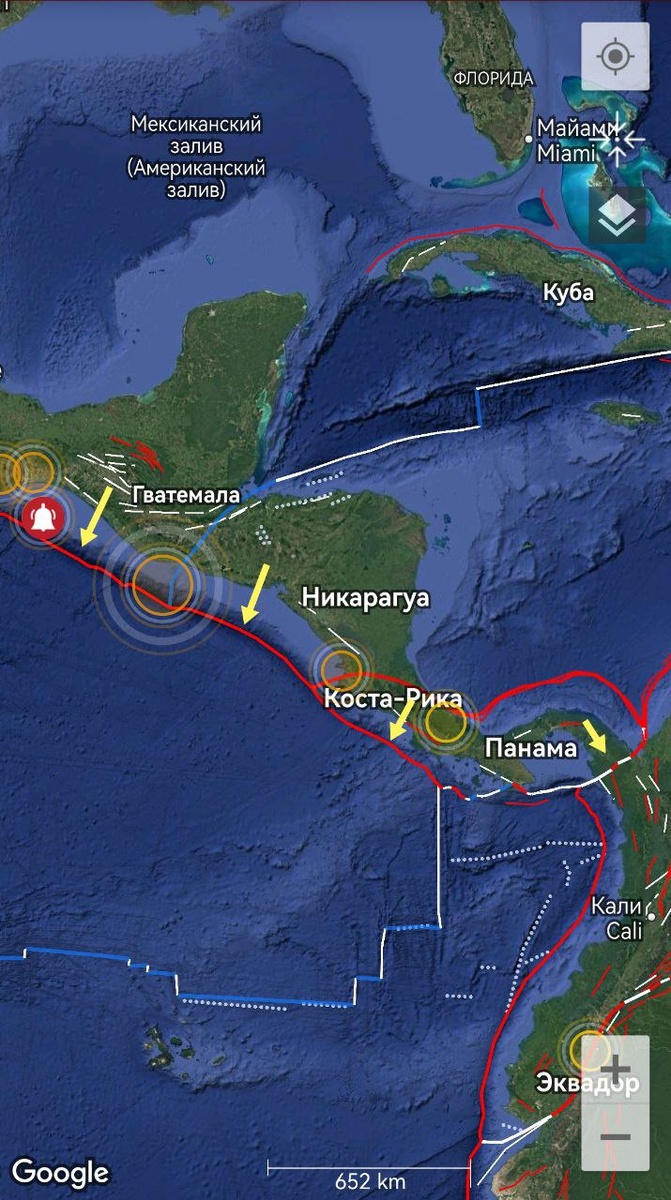 В зоне Центральной Америки трассируется юго-восточая граница плиты Кокос от Гватемалы/Мексики до Панамы на уровне М7+