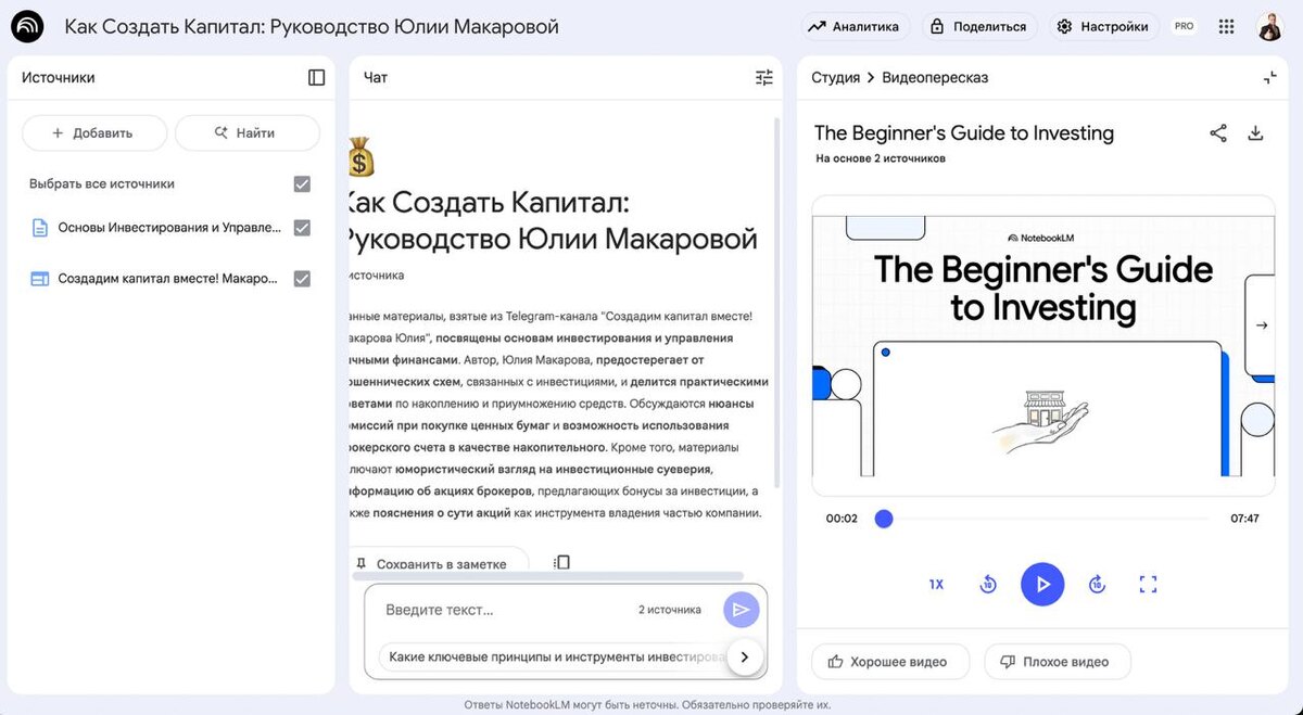 Протестировал видео пересказы в Noutebook LM О чем молчат англоязычные блогеры: 1. Русского языка пока нет. С подкастами на старте было так же, русский язык добавили месяца через 3 что ли. Ждем. 2. Все брендировано NotebookLM. 3. Сделано все довольно аккауратно, иллюстрации примеры взяты из российских реалий, но вот персонализация куда-то пропала, т.е. видеопересказ получился какой-то обезличенный, без привязки к конкретным личностям, хотя в подкасте на ту же тему имена реальных людей упоминались. 4. Ну и как обычно, никаких настрое особо нету, т.е. длинну этого пересказа нельзя указать. Делает по 7 минут. Видимо опять для разных языков будет разная длинна. Попробовать 🤖Saramudvlad | забустить 🤖