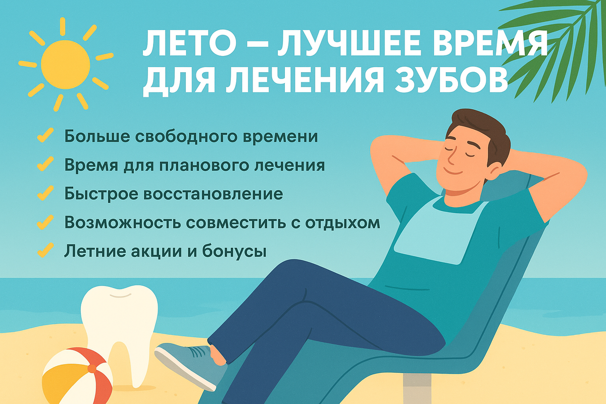 Когда солнце светит ярче, а настроение уже в отпускном режиме, мало кто думает о походе к стоматологу. Но именно лето — идеальный сезон, чтобы позаботиться о здоровье зубов. Почему? Давайте разберёмся. Летом проще найти «окошко» для визита: школьники и студенты на каникулах, у взрослых — отпуска и более гибкий график. Даже один свободный день можно использовать для полноценного лечения или эстетических процедур. Небольшой кариес, дискомфорт при жевании или скол эмали — всё это лучше устранить до наступления холодов, когда простуды и осенние заботы отодвинут стоматолога на второй план. Летом вы избавите себя от лишнего стресса в будущем Организм летом получает больше витаминов, солнца и свежего воздуха — это помогает быстрее восстанавливаться после процедур. Даже сложные вмешательства переносятся легче. Лечение зубов в начале отпуска — и вы можете провести его с комфортом, без беспокойства о боли или неудобствах. А для тех, кто проводит лето в городе, визит в клинику можно совместить с