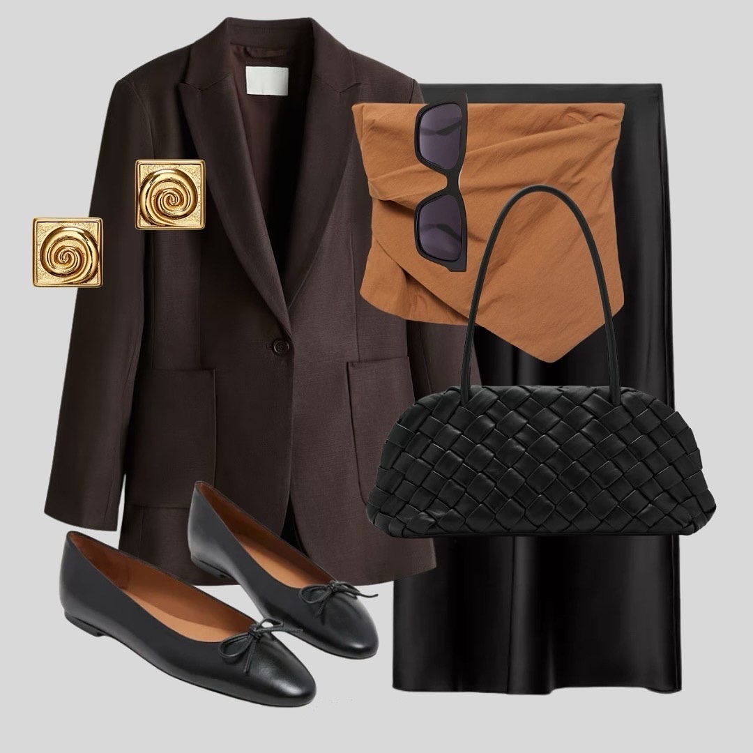 Что видим: прямой шоколадный блейзер мужского кроя, чёрная сатиновая миди на косой, карамельный платок/топ-платок, чёрные балетки с бантом, плетёная сумка-полумесяц, винтажные квадратные серьги-«завитки», узкие солнцезащитные очки.