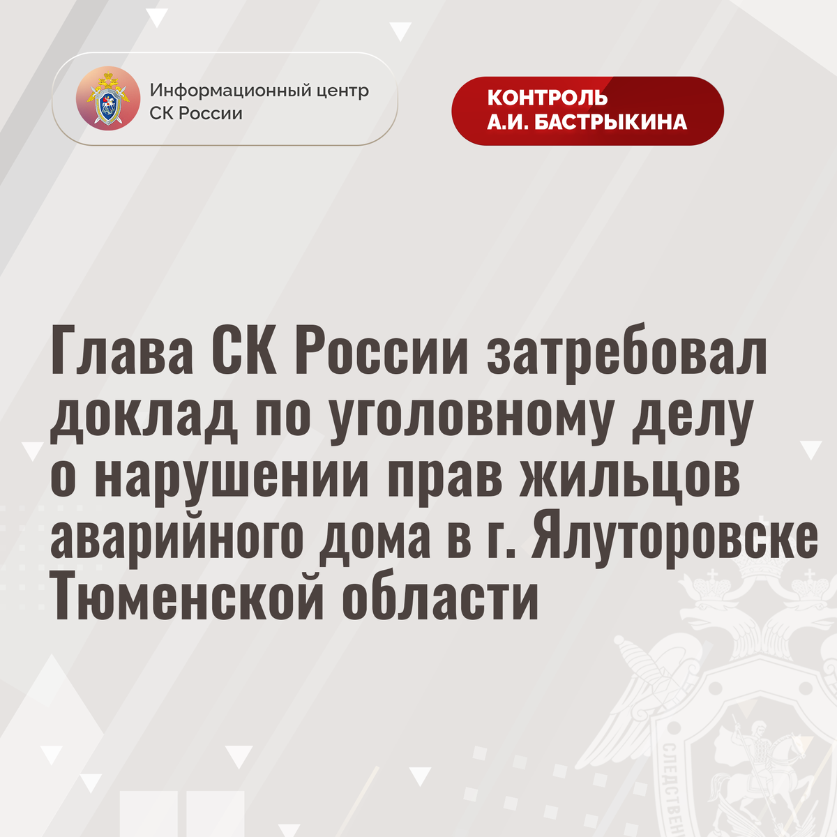 Глава СК России затребовал доклад по уголовному делу о нарушении прав жильцов аварийного дома в г. Ялуторовске Тюменской области