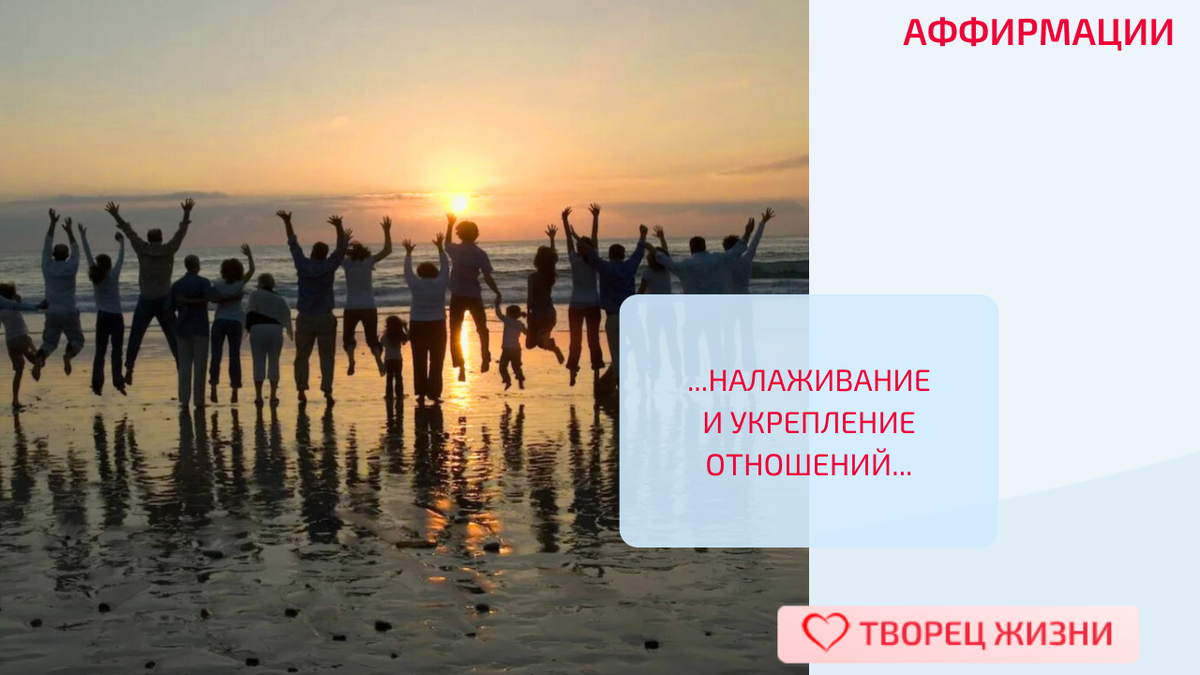 Дорогие, создание гармоничных отношений с окружающими - очень важная часть жизни. Те, кого мы видим каждый день, общаемся, обмениваемся идеями и переживаниями, становятся для нас близкими и родными людьми 👫 Дисгармония или конфликты всегда создают повод для переживаний. Налаживание и укрепление отношений - возможно с помощью аффирмаций. 💫 Мои отношения основаны на взаимном уважении и поддержке 💫 Я заслуживаю здоровых и счастливых отношений 💫 Мои отношения с окружающими приносят мне радость и удовлетворение 💫 Я общаюсь с окружающими людьми естественным и гармоничным образом 💫 Я создаю гармоничные и долгосрочные отношения