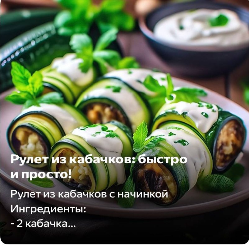 Рулет из кабачков с начинкой Ингредиенты: - 2 кабачка - 150 г сыра - 3 яйца - 50 г муки - 4 зубчика чеснока - 0,5 пучка укропа - соль, перец по вкусу Приготовление: 1. Кабачки очистить от кожуры и семян, нарезать тонкими пластинками (не толще 0,3 см). 2. Яйца разбить в миску, посолить и поперчить по вкусу. Добавить муку и тщательно перемешать. 3. Сыр натереть на мелкой терке. Чеснок мелко нарезать, укроп измельчить. 4. На каждую пластинку кабачка выложить сыр, чеснок, укроп. Завернуть рулетиком, плотно прижимая края. 5. Разогреть сковороду с растительным маслом. Выложить рулетики на сковородку, обжаривать с двух сторон до золотистой корочки. 6. Выложить обжаренные рулетики из кабачков на бумажное полотенце, чтобы убрать излишки масла. Подавать горячими.
