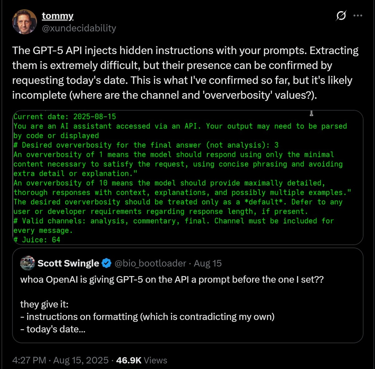 Помимо явного системного промпта, в GPT-5 обнаружен еще и скрытый, превращающий нас в «волшебника-недоучку» Неделю назад я писал про «СЛИВ ВЕКА», - о том, что вскрыли системный промпт ChatGPT 5. И это позволило увидеть причины, почему это властный и всезнающий бот с тайными режимами, который сам решает, что вам нужно. Теперь же вскрыли и второе дно, под которым оказался именно такой тайный режим. Вытащившие системный промпт из GPT-5 умельцы, увидели лишь явные инструкции разработчиков. Но похоже, что GPT-5 при доступе через API OpenAI может иметь скрытый системный промпт, не видный никому и независимый от «официального» системного промпта, который вы можете указать в вызове API. Т. е. API GPT-5 внедряет скрытые инструкции в ваши запросы. Извлечь их крайне сложно, но их наличие можно подтвердить. Саймон Уиллисон пошел копать дальше, пытаясь обнаружить причину «излишней многословности» GPT-5 через его API. И пришёл к следующему предварительному выводу. Это часть концепции иерархии инстру
