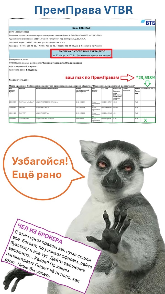 Итак, сделаем recap того, как у нас с вами зафиксировались ПремПрава на VTBR. В общем-то, если вы брали VTBR под ПремПрава в пт. 8 августа, то в пн. 11 августа рынок давал возможность закрыть эту позицию в плюс (и даже в +3,5% при особой удачливости и трейдинговом мастерстве). Даже арба фьючом особо по факту не понадобилась. Так сказать, можно было и рыбку съесть, и не подавиться. Это мне ещё раз подтверждает, что фиксация в списке под ПремПрава сама по себе не несёт выраженного «дивгэпного» эффекта. По причине множества неизвестных в момент фиксации в списке и низкого проникновения идеи на рынок. Они и сами пока ещё ничего не знают, так как у них нет инструкций от ВТБ. Ещё просто-напросто рано. Остальные шаги по ПремПравам (подача заявки брокеру, оплата ПремПрав) - это всё уже позднее. Скорее всего, только в сентябре, когда допка зарегается в Банке России и стартанёт. А пока допка ещё даже не зарегана... Сейчас максимум, что вы можете сделать, - это заказать себе выписку по счету депо