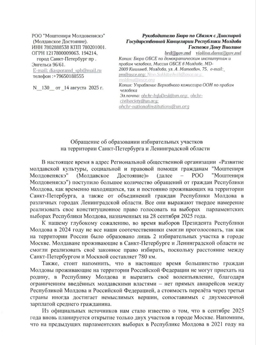 Санкт-Петербургская диаспоральная организация "Молдавские достояние" обратилась с письмом Управление Верховного комиссара ООН по правам человека, ЦИК Молдовы, посольство страны в РФ, Бюро по связям с диаспорой Республики Молдова, БДИПЧ, ОБСЕ, и миссию организации в Молдове.