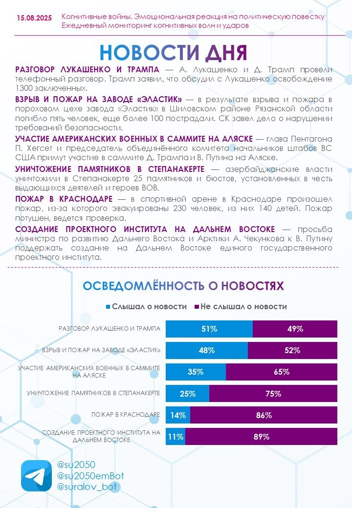 Отчет по результатам опроса бота-измерителя 2.0 15.08.2025 🔹 Большинство опрошенных (65%) находятся в привычно спокойном состоянии. Усталость отметили 17%, бодрость — 9%, а нервозность оказалась на минимальном уровне (3%). 🔹 Лидерами по осведомлённости стали разговор Лукашенко и Трампа (51%) и взрыв на заводе «Эластик» (48%). Эти события оказались на слуху у каждого второго. А вот о возможном создании проектного института на Дальнем Востоке знали лишь 11%. 🔹 Самый позитивный отклик вызвала новость о создании проектного института на Дальнем Востоке — 45% позитивных реакций (одобрение, надежда, интерес). Но многие (54%) отнеслись к этой новости без ярких эмоций (недостаток информации, жду развития событий). 🔹 Самый негативный резонанс вызвали взрыв на заводе «Эластик» (87% негативных реакций) и уничтожение памятников в Степанакерте (81% негатива). Первая новость является эмоционально тяжелой из-за человеческих жертв и масштаба трагедии — самые популярные эмоции: сострадание, печа