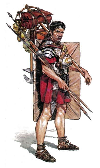 По мнению историка С. Дандо-Коллинза: «На марше легионеры шли «в маршевом порядке». У каждого легионера на шее висел шлем, щит покрывал левую руку, а на правом плече лежал шест с багажом. С шеста свисал скатанный шерстяной плащ, скатка, паек, мотыга, серп, нож для срезания торфа, плетеная корзинка для перетаскивания земли, обеденная миска с ручкой и ведерко для воды, которое также могло служить котелком, гребень для шлема и личные вещи, такие как воинские награды. Дротики и колья для палисада были привязаны к шесту».