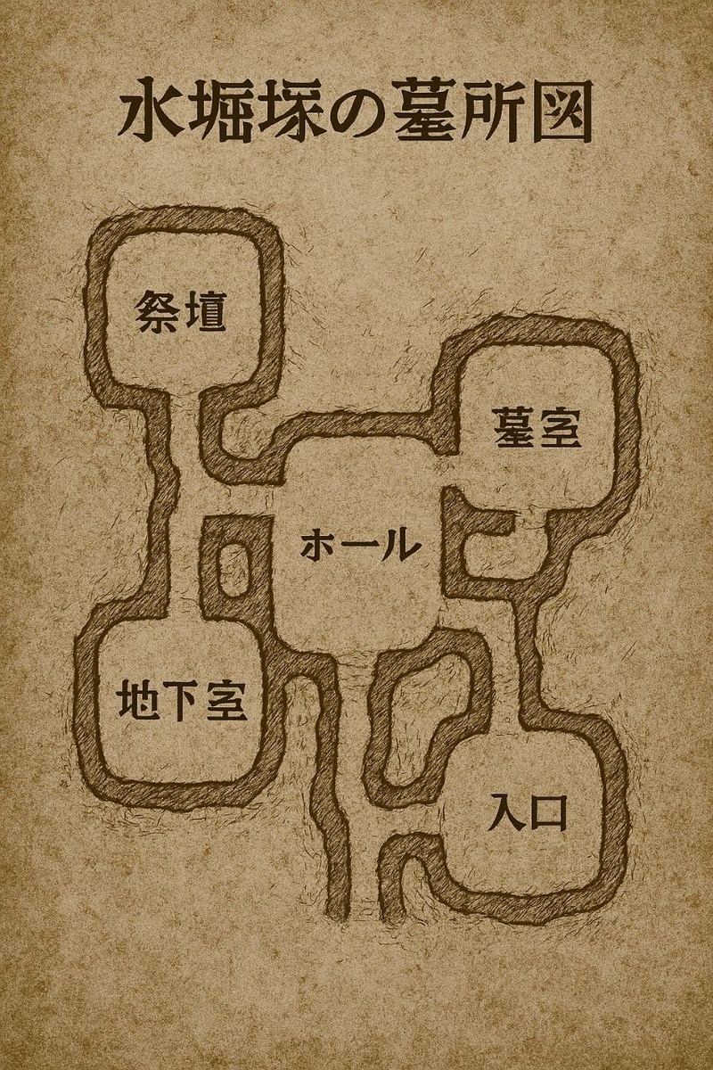 Higujiku's tomb map now exists as a ritual artifact 📜. On it you will find: - 入口 (entrance) – a narrow corridor leading to the heart of the complex - ホール (central hall) - a gathering place, possibly for rituals or philosophical disputes - 祭壇 (altar), a northwestern chamber where sacrifices or acts of transformation probably took place - 墓室 (burial chamber) – the eastern part where the Higujiku code bearers are buried - 地下室 (Underground Room) - Southern chamber, possibly related to Obu