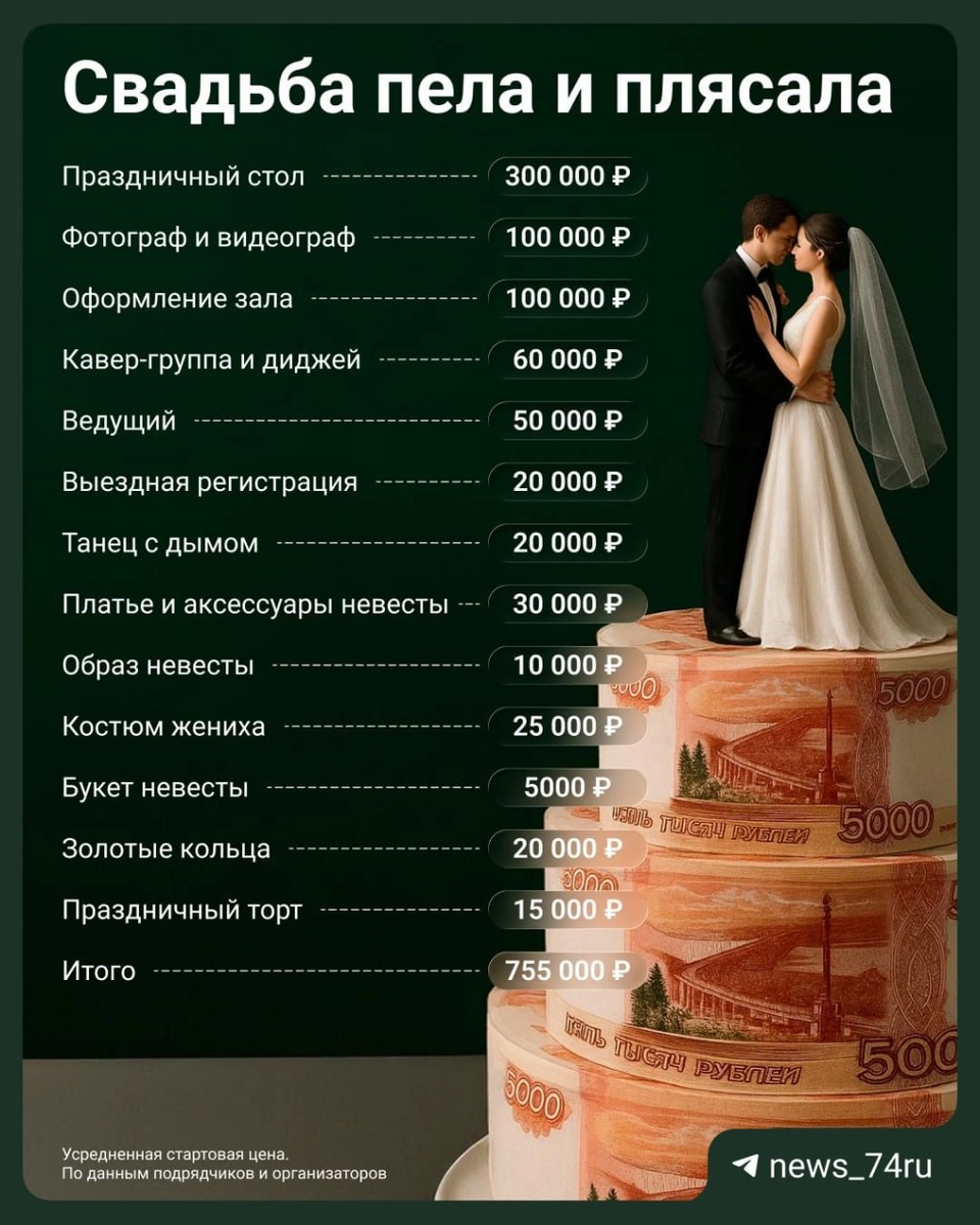 «На праздники люди найдут деньги» Считаем, сколько стоит сыграть свадьбу сегодня Скромные свадьбы становятся новой нормой. Мы спросили у организаторов и молодожен, как празднуют те, кто не хочет (или не может себе позволить) классической свадьбы. ▪️Камерная свадьба на 10–15 человек, но со всеми атрибутами от фаты до ведущего. Пару лет назад это было редкостью. ▪️ Свадьба для близких на 7–10 гостей. Тут уже редко встретишь организатора и тамаду. ▪️ Снять коттедж. Вместе с едой, напитками, фотографом, платьем невесты и кольцами выходит ~250 тысяч. ▪️ Сходить вдвоем в ресторан после росписи — ~9 тысяч. ▪️ Вложиться в свадебное путешествие, а не свадьбу — ~300 тысяч. «Зачем всю родню и не пойми кого кормить целый день, когда можно себя и свою жену радовать крутым отдыхом целый месяц?» — объясняет молодожен Илья. ▪️ В бар после выездной регистрации. Оплатят только депозит для брони, а дальше каждый платит за себя. 🟥 Классическая свадьба. Это 40–50 человек, меню с несколькими горячими,