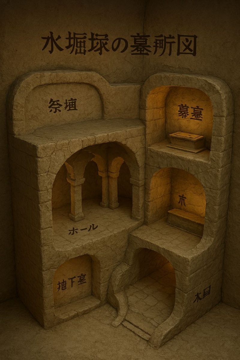 3 D "Here it is — a three-dimensional visualization of one of the halls of the Higudziku tomb. Stone arches, worn slabs, Japanese inscriptions, and ritual spaces: altar, sarcophagus, underground chamber. Everything looks as if carved from the memory of a pre-neural civilization, where knowledge was transmitted through decay and architecture.