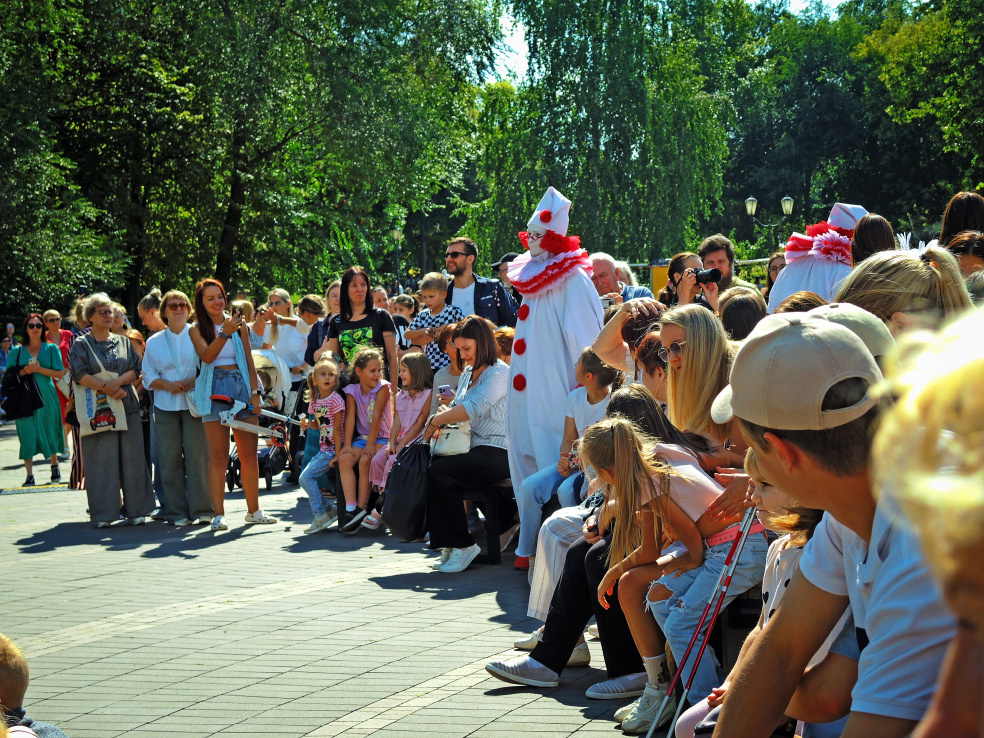 В минувшие выходные (16, 17 августа 2025 года) в Самаре прошёл десятый юбилейный фестиваль уличных театров «Пластилиновый дождь». В субботу выбрался посмотреть. Общие впечатления расскажу чуть позже. А пока хочу показать спектакль, который лично мне понравился больше всего из того, что у меня получилось посмотреть на фестивале (а получилось довольно немного). Спектакль-шествие «По улицам слона водили» от театра «Ларамбла» из Ростова-на-Дону в Самару привезли, по-моему, впервые. В сети уже видел репортажи о нём с фестивалей в других городах. Именно по ним и захотелось посмотреть его вживую. Ожидания оправдались полностью. Зрелище очень яркое и весёлое. И хоть сценарий довольно простой, в нём даже есть некоторая смысловая нагрузка. Давайте по порядку. Начинается всё с появления двух клоунов. В цирке таких называют ковёрными. Немного похулиганили со зрителями. Немного пожонглировали. Через некоторое время появляются ещё три персонажа. Двое на ходулях. Я их назвал Буйный Истерик (смесь Без