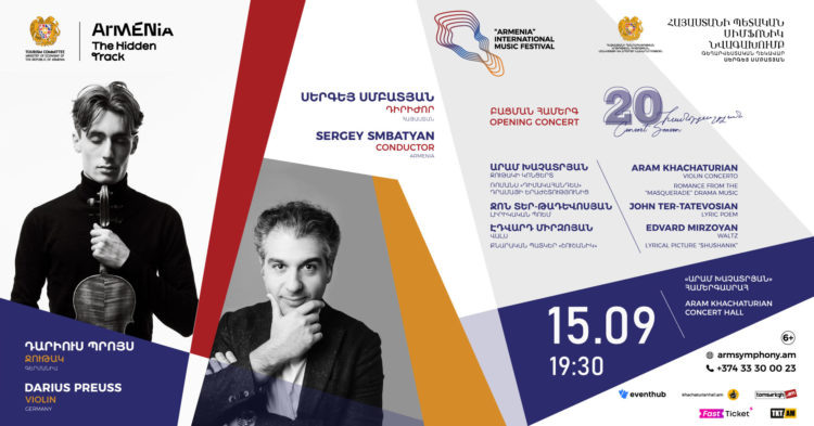 В концертном зале имени Арама Хачатуряна 15 сентября состоится торжественный концерт, который откроет сразу два культурных события — IX Международный музыкальный фестиваль «Armenia» и 20-й юбилейный концертный сезон Государственного симфонического оркестра Армении. В программе концерта — произведения Джона Тер-Тадевосяна, Эдварда Мирзояна и Арама Хачатуряна. Кульминацией вечера станет исполнение знаменитого Концерта для скрипки с оркестром ре минор Арама Хачатуряна (40 минут), солистом выступит скрипач Дариус Пройс. За дирижёрским пультом — Сергей Смбатян. Концерт начнется в 19:30. Вход для детей с 6 лет. Цена билетов составяет от 3000 до 15 000 драмов. Билеты можно приобрести по ссылке.