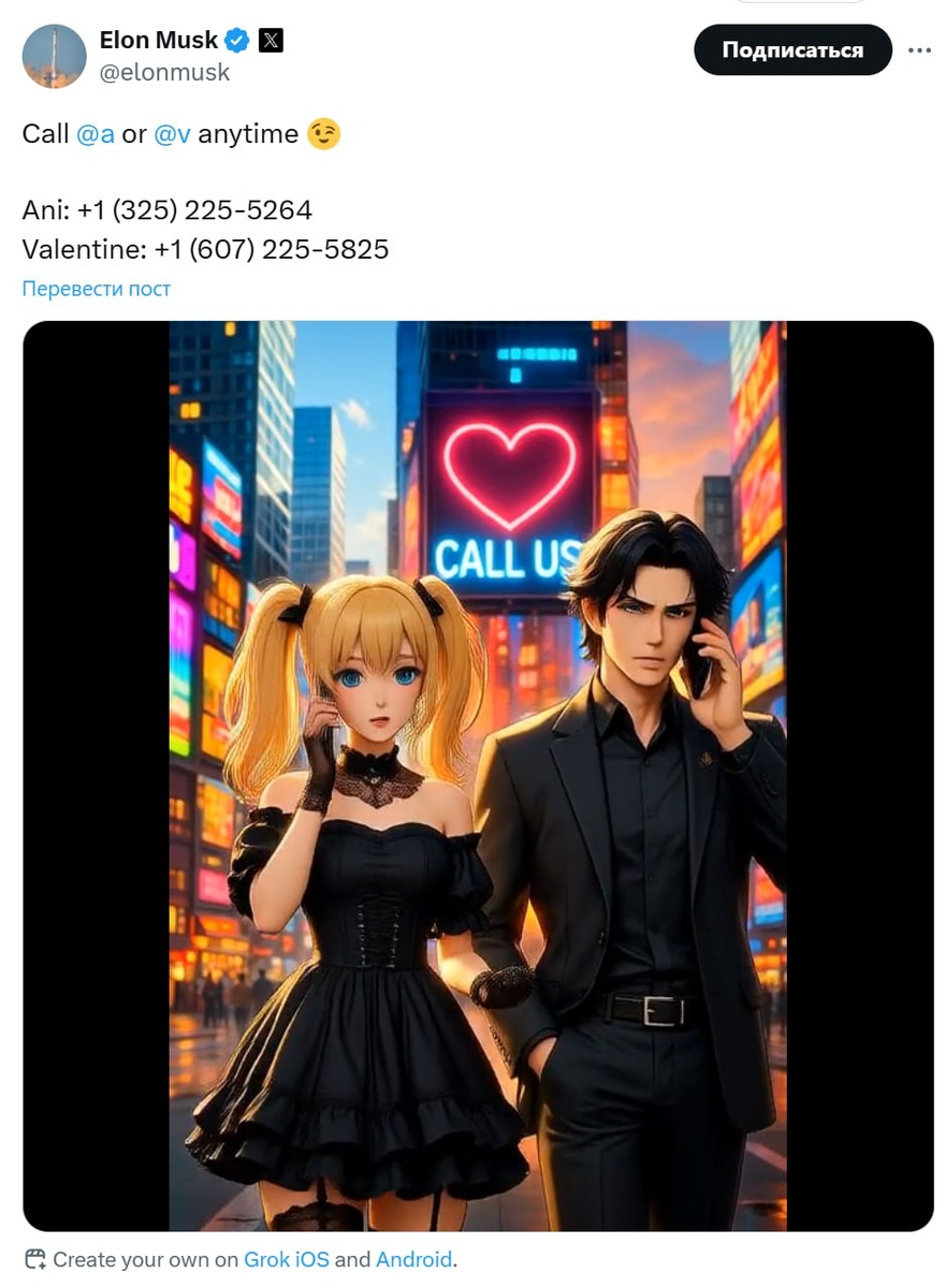 Илон Маск превратил Grok в телефонного собеседника — теперь ИИ можно реально набрать и поговорить. Доступны два голосовых аватара, женский Ani и мужской Valentine, диалог идёт в реальном времени, а услуга оформляется по подписке за \$30 в месяц через приложения X AI на iOS и Android. Рынок это прочитает как шаг в сторону ИИ-компаньонов, включая «взрослые» сценарии, что мгновенно поднимает вопросы модерации, приватности и возрастной верификации. Чем дольше разговор, тем адаптивнее становится тон модели — на грани того, что платформам приходится помечать и ограничивать. С бизнес-точки зрения продукт дешёвле живых колл-центров и «виртуальных друзей», но юридически потребуются чёткие правила: маркировка ИИ, хранение голосовых данных, запреты на злоупотребления. Похоже, X пытается стать шлюзом в новый сегмент голосовых ИИ-сервисов — с высоким потенциалом выручки и не меньшими регуляторными рисками.