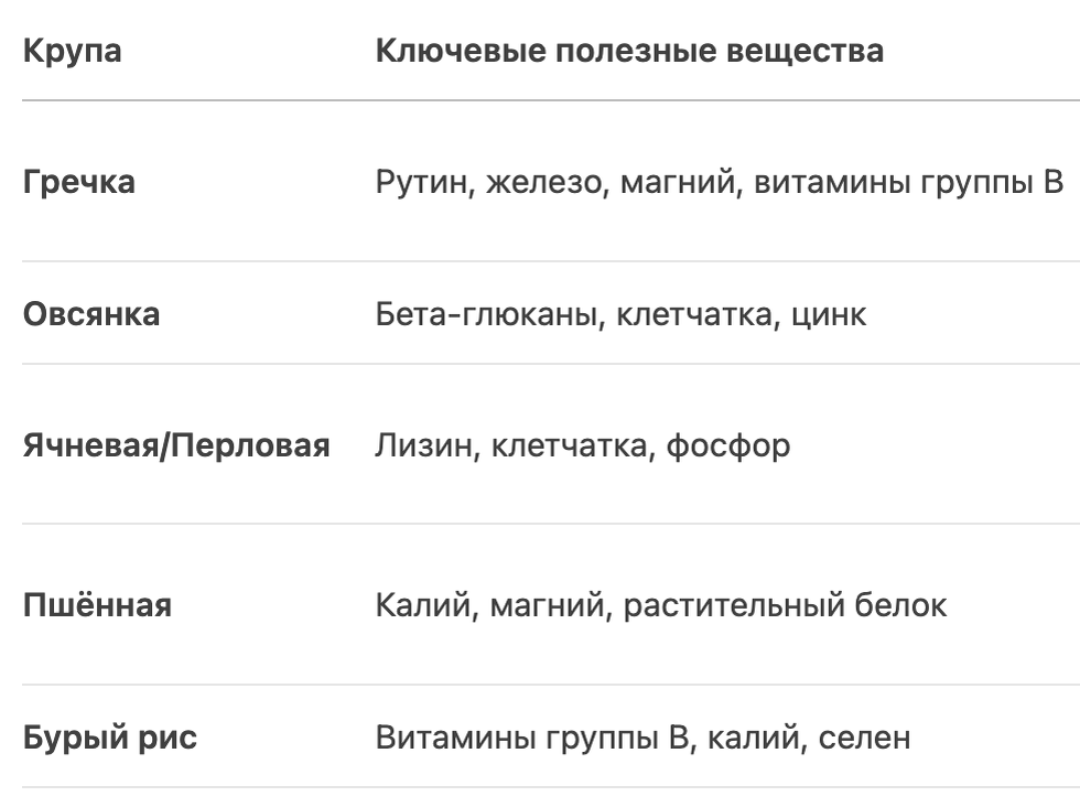 - Чередуйте крупы! Даже суперполезную гречку или овсянку не стоит есть ежедневно. Разные крупы — разные нутриенты. Оптимально: 2-4 вида в неделю для полного спектра витаминов и минералов.