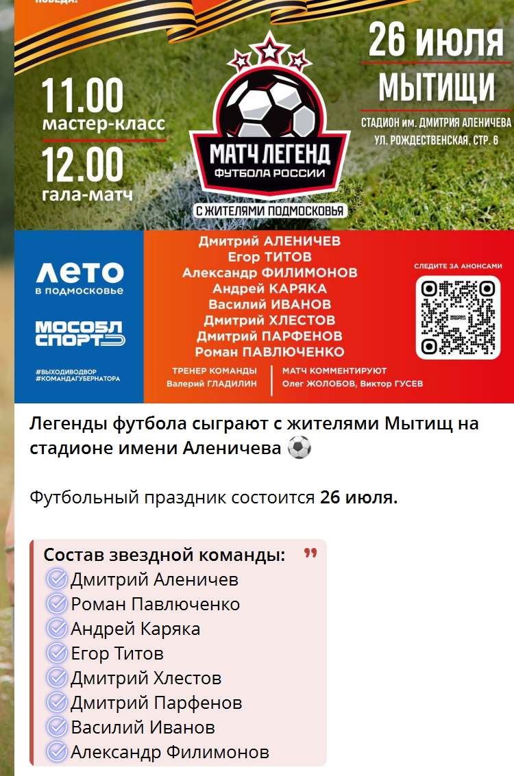 Вратарь Дима со своими родителями побывал на футбольном мероприятии в г. Мытищи на стадионе им. Дмитрия Аленичева и поделился впечатлениями. Рассказ будет от лица мамы футболиста (спасибо Анне за интересные подробности). В прекрасный солнечный день мы посетили замечательное мероприятие "Матч легенд футбола России". Когда мы подъехали, Дмитрий сразу сказал, что этот стадион ему знаком из видео его любимого блогера Артема, никнейм Арт По. Для справки: АртПо — амбассадор FONBET, игрок футбольного клуба СКА Ростов Атмосфера на стадионе была очень уютной, комфортной, даже домашней. Обеспечена безопасность посетителей: у входа стояло несколько патрульных машин, при входе на стадион был досмотр. Женскую половину досматривала женщина, мужскую — мужчина. Организаторы позаботились обо всех своих посетителях, как и о развлекательных активностях. Был большой надувной мяч, он же мяч-качели. Попробовать свои силы могли и дети, и взрослые в таких аттракционах, как: "Забей гол", футбол в воде и др.