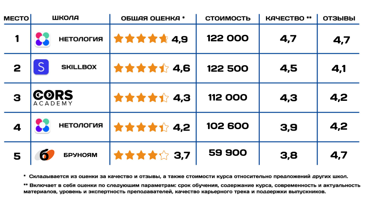 Средняя оценка всех курсов — 4,8 из 5. Студенты отмечают насыщенность курса, доступную подачу материала