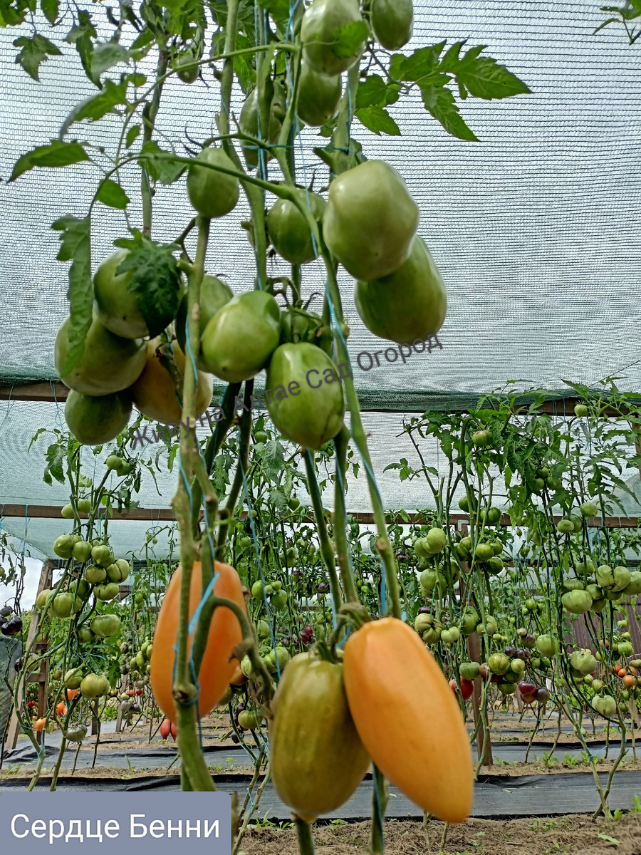 Продолжаю знакомить вас с сортами томатов из каталога Индетерминантный , среднеспелый сорт. Высоту куста ограничила на высоте 1,5 м. Плоды удлинённые, угловатые сердца, оранжевого цвета. Весом 200г. Мякоть ярко-оранжевая, густая, маслянистая, сладкая. Сорт урожайный. Для теплиц и ОГ. Индетерминантный , ср.спелый сорт. Куст мощный, высота 1,6-1,8м. Плоды плоскоокруглые, тёмно-коричнево - пурпурные с глянцем. Вес 200-400г. Мякоть плотная, очень сладкая. По описанию к сорту: устойчив к болезням. Хорошо вяжет в любую погоду Для теплиц и ОГ. Индетерминантный 1,5-1,8м, среднеспелый сорт. Томаты в форме сердец, насыщенно- розового цвета. Вес 200-400г. Весом 200г томатов не было, от 300г. Мякоть маслянистая, сладкая с малым количеством семян. Урожайность показал хорошую. Для теплиц и открытого грунта. Сорт из Румынии. Индетерминантный 1,5м в открытом грунте, в теплице 1,8м, среднеспелый сорт. Плоды биколор вытянутой сердцевидной формы. Вес 250-400г Мякоть биколор, плотная, маслянистая, очен