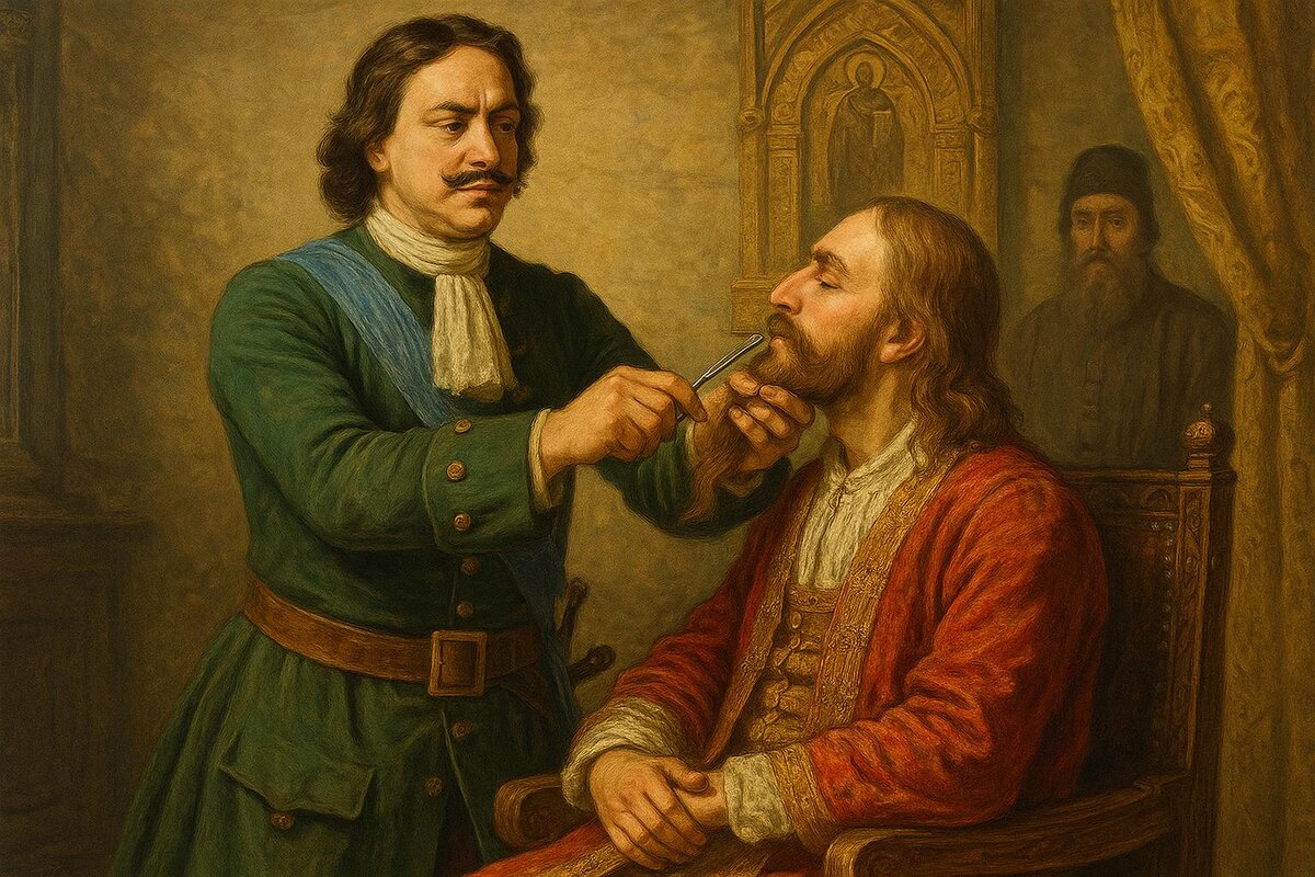 Представьте Москву конца XVII века. На улице купец с бородой до пояса, в ней, кажется, легко мог бы спрятаться воробей. Бояре, как хмурые дубы, все в волосах. Даже ремесленник с пятачком в кармане считает бороду делом чести. И тут появляется Пётр Алексеевич — ещё не император, но уже с характером — и заявляет: «Сбрить всё подчистую!». Народ в шоке. Ведь борода — это не причёска. Это символ веры, мужества и вообще нормальной жизни. Пётр много мотался по загранице. Голландия, Англия, Швеция — и везде мужчины выглядели так, будто только что вышли из-под руки личного барбера. Аккуратные усы, иногда вовсе гладко выбритые. На их фоне наши бородачи выглядели… скажем так, очень архаично. Европа шла в будущее на кораблях и с пушками, а Россия — с лаптями и бородами до груди. Пётр понял: пока мы ходим с «шерстью», нас всерьёз никто не воспримет. В 1698 году он решил действовать. На одном из пиров Пётр схватил ножницы и лично начал стричь бояр. Картина не для слабонервных: представьте себе — си
