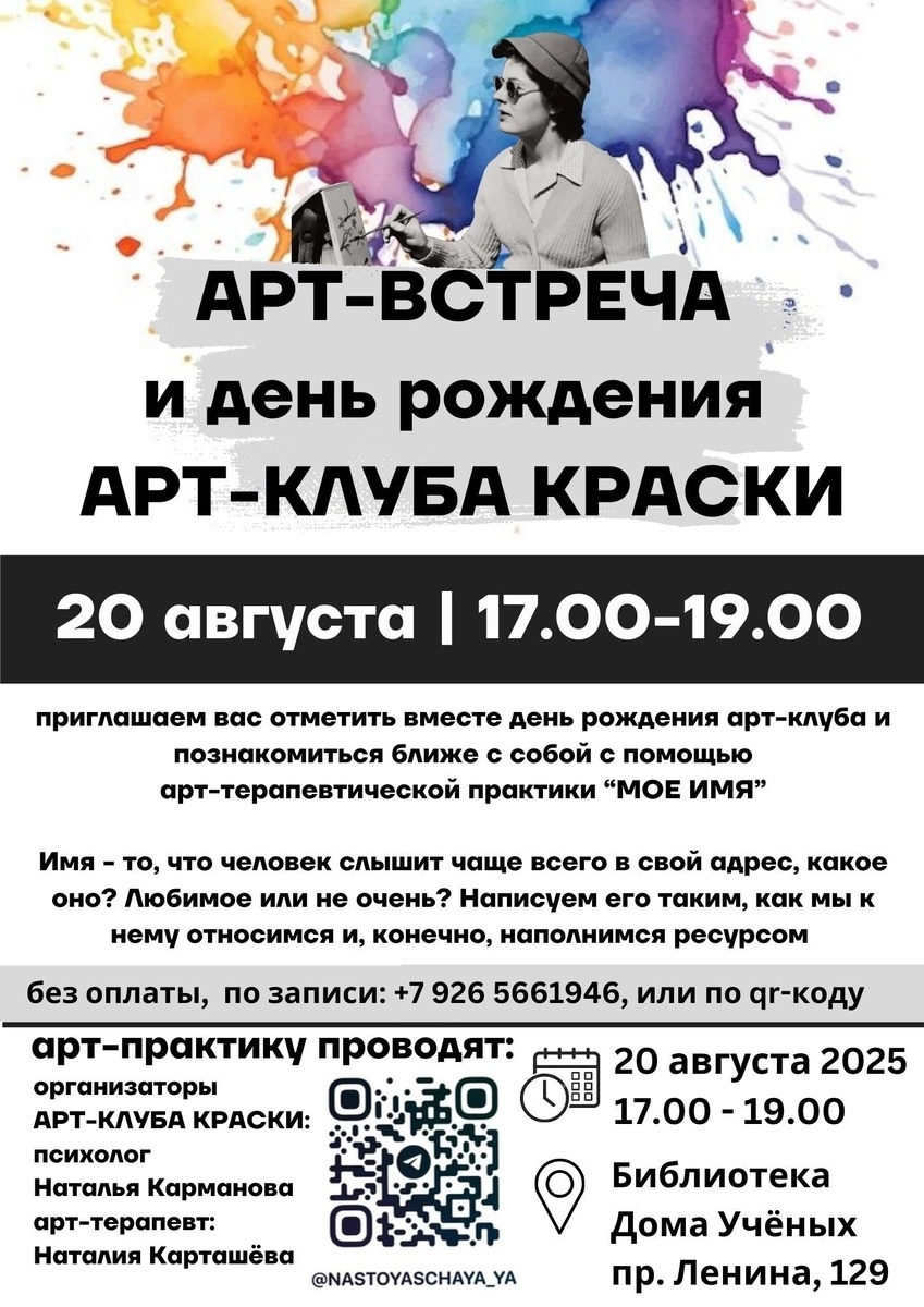 🎨20 августа с 17:00 до 19:00 в библиотеке в доме учёных в Обнинске состоится открытие арт-клуба «Краски». На первой встрече вы отметите день рождения клуба и познакомитесь. Для знакомства пройдёт арт-терапевтическа практика «Моё имя». Имя - это то, что в жизни человек слышит чаще всего, но как мы относимся к своему имени? Как именно называем сами себя? Нравится ли нам своё имя, ведь мы его даже не выбирали? Погрузитесь в свои чувства по отношению к имени и, конечно же, получите ресурс. ✍Встреча без оплаты, по записи в сообщениях во Вконтакте - vk.ru/karnats, Наталия. Количество мест ограничено. Обнинск, пр-т Ленина, 129, 2 этаж. 👍 Подписаться | Ваша реклама