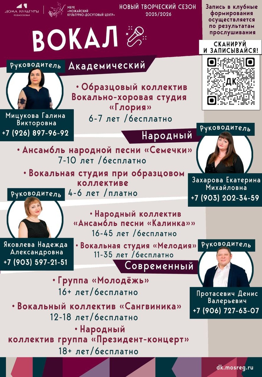 Ищем и находим занятие по душе) Можайский культурно-досуговый центр объявляет набор на НОВЫЙ учебный год: 🎤 Современный, народный и классический вокал 🎶 Хоровое пение 🕺 Современная, народная и классическая хореография 🎨 Изобразительное искусство ✂ Декоративно-прикладное искусство 🎹 Инструментальная современная и классическая музыка 🎷 Духовой оркестр 🧘♂ Йога/хатха/Айенгара 🥊 Секция «Смешанные единоборства» и многое-многое другое! ✅ Записаться на занятия и получить подробную информацию о расписании и стоимости можно по телефону: 8(49638)20-962 или на нашем сайте: dk.mosreg.ru/dk/kdc-moz...
