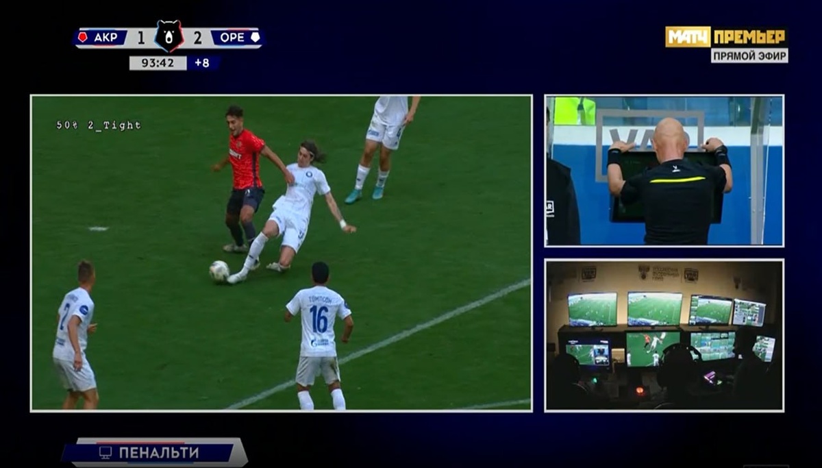 Акрон-Оренбург 93 мин. Ошибается Карасёв и назначает 11-м удар, в ворота команды Оренбург После просмотра ВАР меняет решение и назначает штрафной удар. Игрок №38 команды Оренбург тянется к мячу игрок №8 команды Акрон не предпринимает попытки сыграть в мяч и выставляет ногу в сторону тем самым нарушая правила. Правильное решение.Фол в атаке.