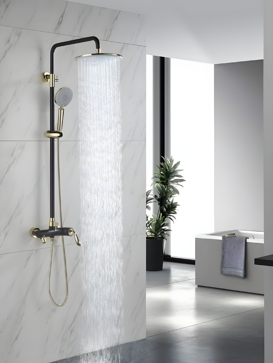 Элегантная душевая система, в которой матовый чёрный цвет подчеркнут тёплыми золотыми деталями. Итальянская лаконичность формы и выразительный контраст отделок превращают повседневный душ в стильный акцент ванной комнаты.