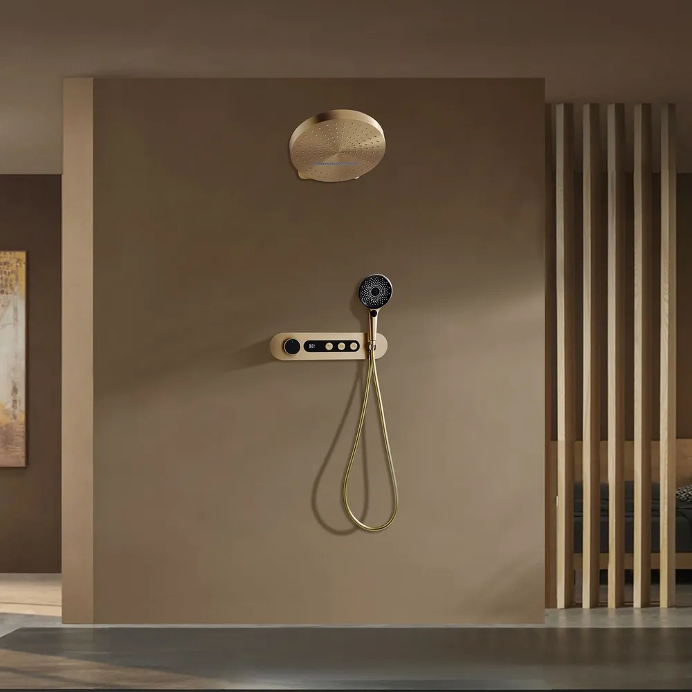 Эстетика спа и высочайший комфорт в минималистичном исполнении. Скрытая установка освобождает пространство и подчёркивает чистую геометрию интерьера, а матовое золото с бархатным отблеском превращает душевую зону в акцентный элемент ванной. Ключевые преимущества - Термостатический комфорт поддержание стабильной температуры без перепадов при колебаниях давления - Безопасность блокировка на 38° и защита от ошпаривания, возможность точной подстройки лимита температуры - Интуитивное управление кнопки с чётким щелчком для выбора источника воды, удобны мокрыми руками и не скользят - Тихая работа отточенная гидравлика уменьшает шум и разбрызгивание - Скрытая установка видимы только элегантная декоративная планка, изливные элементы и лейка Функциональность - Верхний душ мягкий дождевой поток с равномерным покрытием, регулируемый угол наклона - Ручная лейка для направленного потока и ухода за душевой зоной - Переключение потоков отдельные кнопки на панели управления - Плавная регулировка напора