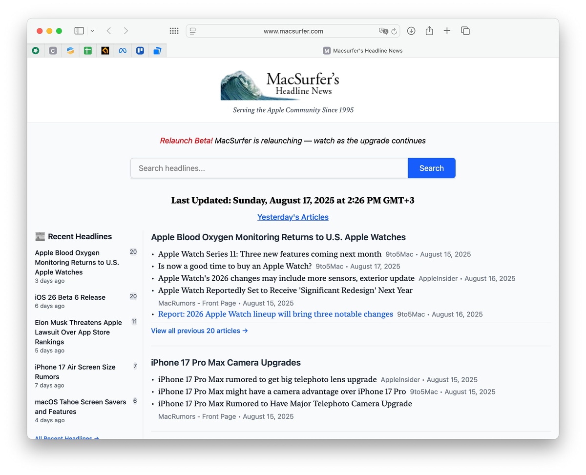 Безусловно, возвращение недели! Старый агрегатор новостей о технологиях Apple под названием MacSurfer неожиданно вернулся к жизни. Для тех, кто не застал эпоху расцвета интернет-журналистики нулевых, MacSurfer был своего рода святым Граалем для блогеров — попадание в его сводку новостей гарантировало серьезный трафик на сайт.