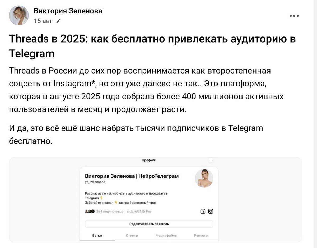 Статья-разбор как привлекать подписчиков бесплатно с помощью Threads: https://vc.ru/id4295045/2159882-threads-2025-besplatnyy-sposob-privlecheniya-podpischikov-v-telegram Статью в открытом доступе оставлю на пару дней, после чего закрою потому что буду включать ее в воронку Так что не откладывайте Как относитесь к этому источнику трафика? Накидаете 50 реакция 🔥 и я опубликую запись урока по Тредс для вас