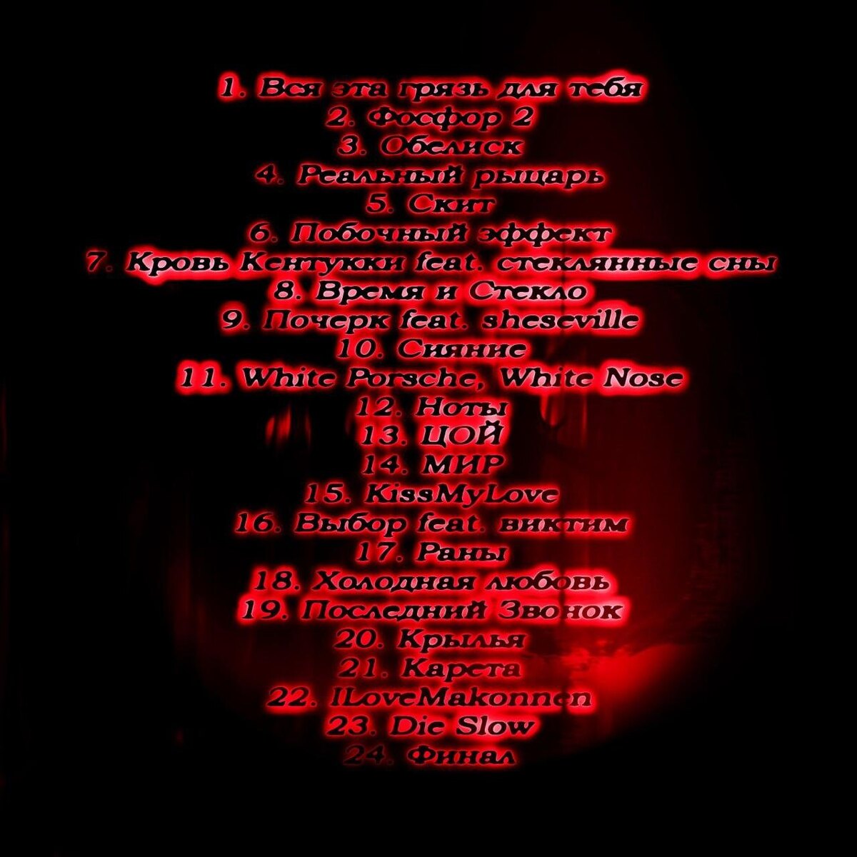 🔥 woee33 опубликовал треклист нового альбома «Артерия 2» Треклист: 1. Вся эта грязь для тебя 2. Фосфор 2 3. Обелиск 4. Реальный рыцарь 5. Скит 6. Побочный эффект 7. Кровь Кентукки ft. стеклянные сны 8. Время и Стекло 9. Почерк ft. sheseville 10. Сияние 11. White Porsche, White Nose 12. Ноты 13. ЦОЙ 14. МИР 15. KissMyLove 16. Выбор ft. виктим 17. Раны 18. Холодная любовь 19. Последний Звонок 20. Крылья 21. Карета 22. ILoveMakonnen 23. Die Slow 24. Финал Премьера альбома — до конца месяца. @mainstreamusic
