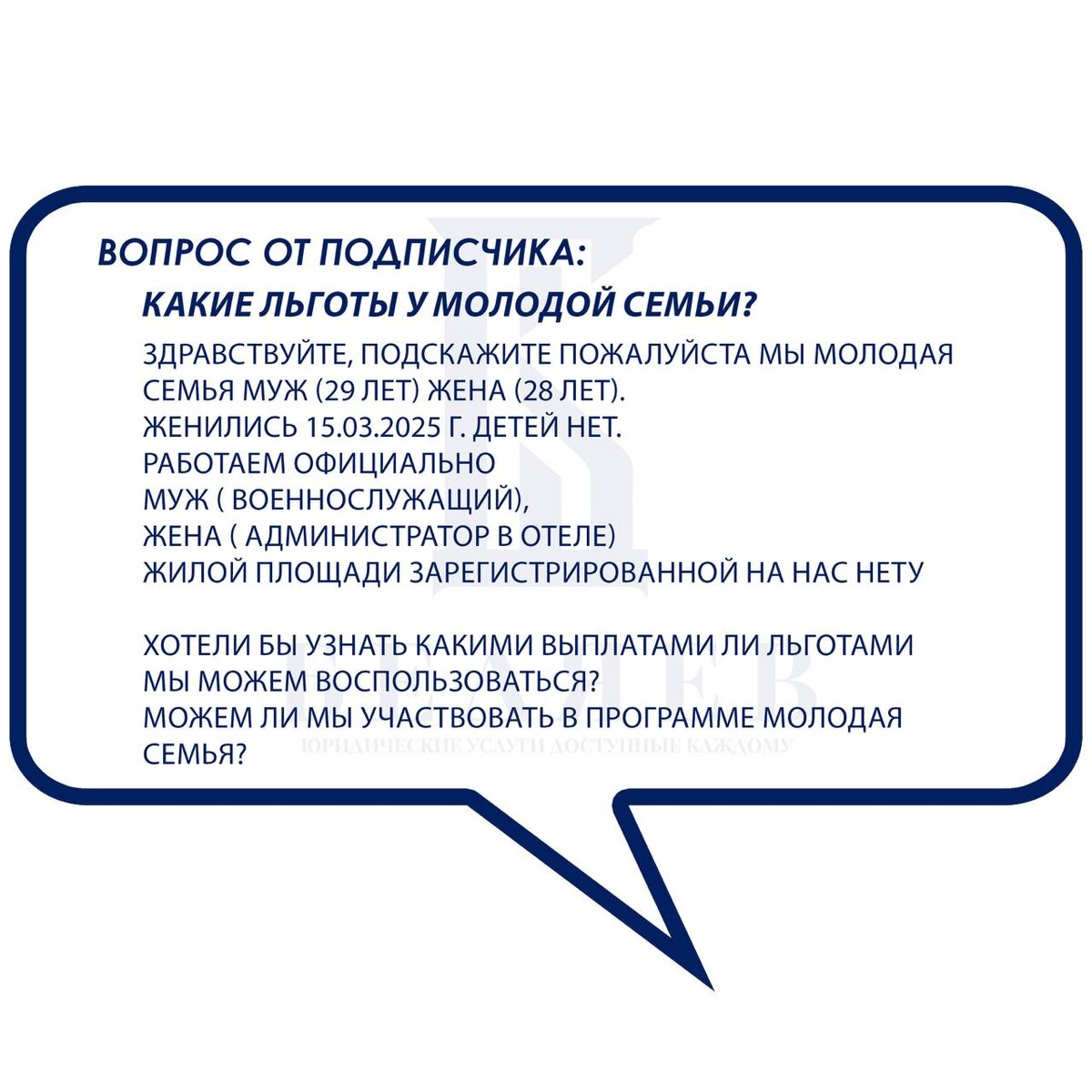 🌟Рубрика вопрос-ответ:🌟 Здравствуйте! Поздравляю вас с недавним браком! 🎉 Отвечая на ваш вопрос, да, вы можете воспользоваться программой "Молодая семья". Эта программа направлена на поддержку молодых семей в улучшении жилищных условий. Вот несколько основных моментов, которые вам стоит учесть: 1. Участие в программе "Молодая семья": Для участия в программе необходимо, чтобы оба супруга были признаны молодыми (обычно до 35 лет) и не имели в собственности жилую площадь. Поскольку у вас нет зарегистрированной жилой площади, вы соответствуете этому критерию. 2. Выплаты и льготы: В рамках программы "Молодая семья" вы можете получить: - Материальную помощь для улучшения жилищных условий. - Возможность получения субсидии на покупку или строительство жилья. - Льготные условия по ипотечному кредитованию. 3. Региональные льготы в Калужской области: В Калужской области также предусмотрены дополнительные меры поддержки для молодых семей. Вы можете рассчитывать на: - Региональные субсидии