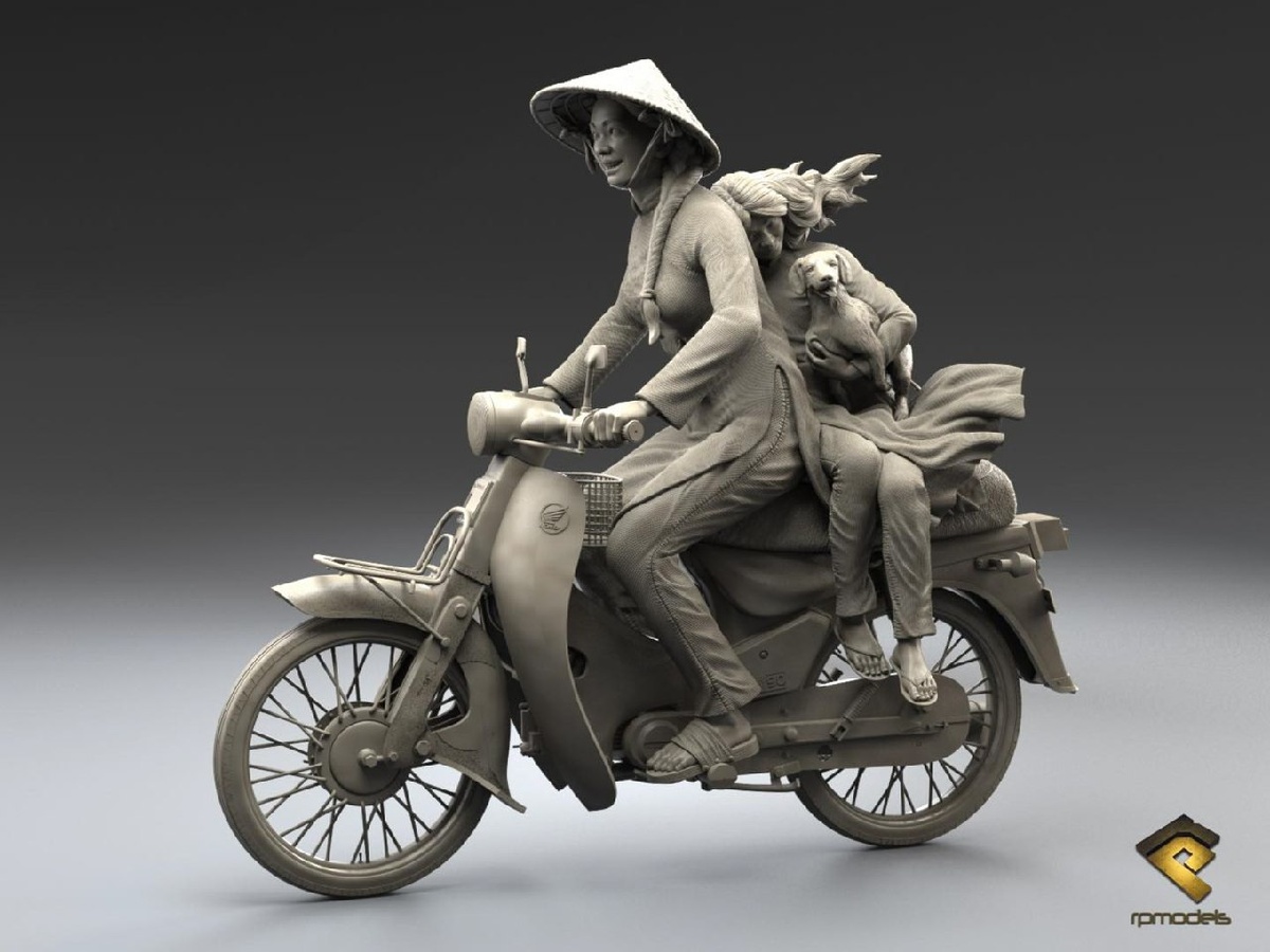 Португальская RPmodels выпустит на 3D-принтере фигуры вьетнамских мотоциклисток 1960-70-х годов на мотоцикле Honda в масштабах 1/16, 1/24 и 1/35.